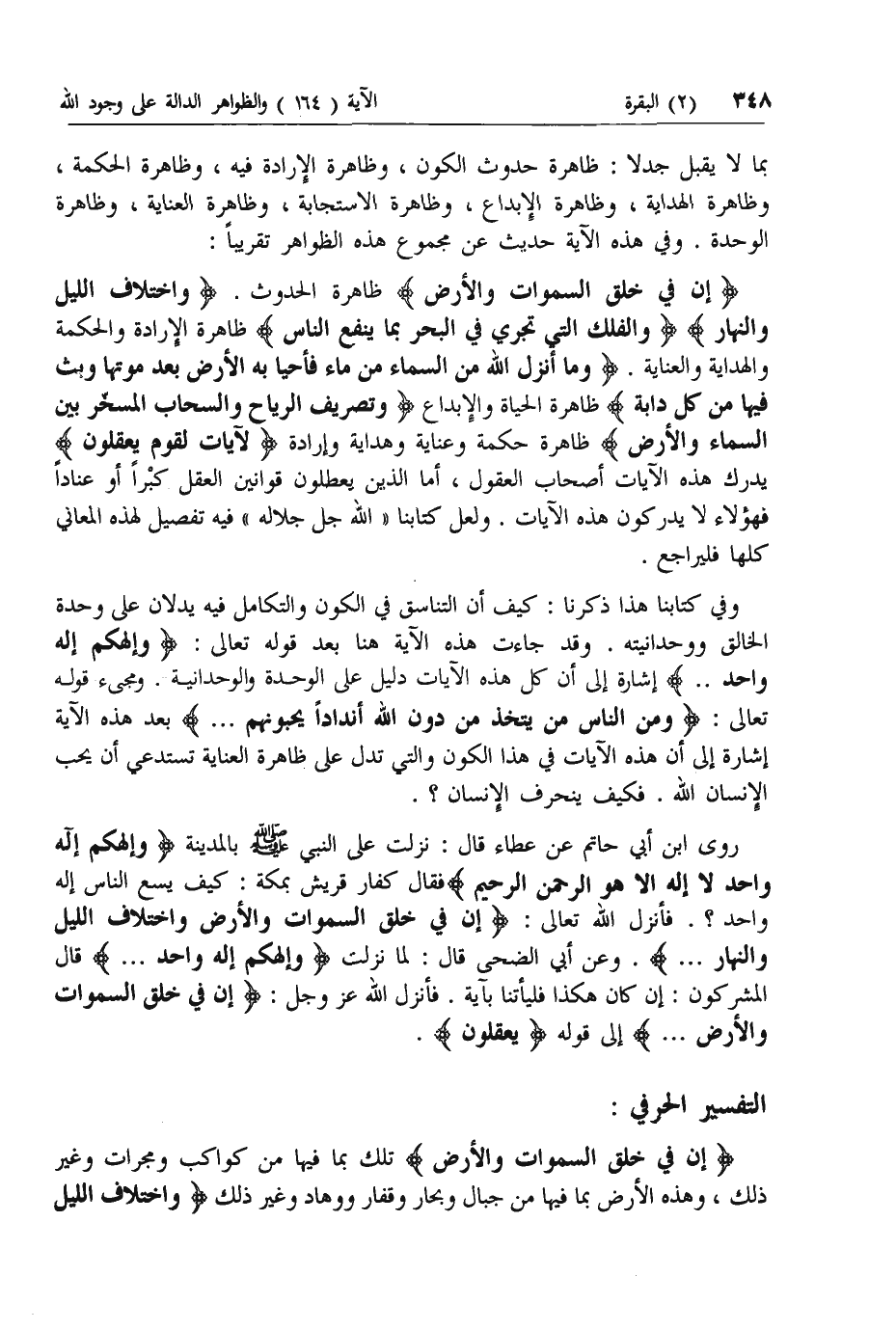 إِنَّ فِي خَلْقِ السَّماواتِ وَالْأَرْضِ ظاهرة الحدوث. وَاخْتِلافِ اللَّيْلِ وَالنَّهارِ وَالْفُلْكِ الَّتِي تَجْرِي فِي الْبَحْرِ بِما يَنْفَعُ النَّاسَ ظاهرة الإرادة والحكمة والهداية والعناية. وَما أَنْزَلَ اللَّهُ مِنَ السَّماءِ مِنْ ماءٍ فَأَحْيا بِهِ الْأَرْضَ بَعْدَ مَوْتِها وَبَثَّ فِيها مِنْ كُلِّ دَابَّةٍ ظاهرة الحياة والإبداع وَتَصْرِيفِ الرِّياحِ وَالسَّحابِ الْمُسَخَّرِ بَيْنَ السَّماءِ وَالْأَرْضِ ظاهرة حكمة وعناية وهداية وإرادة لَآياتٍ لِقَوْمٍ يَعْقِلُونَ يدرك هذه الآيات أصحاب العقول، أما الذين يعطلون قوانين العقل كبرا أو عنادا فهؤلاء لا يدركون هذه الآيات. ولعل كتابنا «الله جل جلاله» فيه تفصيل لهذه المعاني كلها فليراجع.
