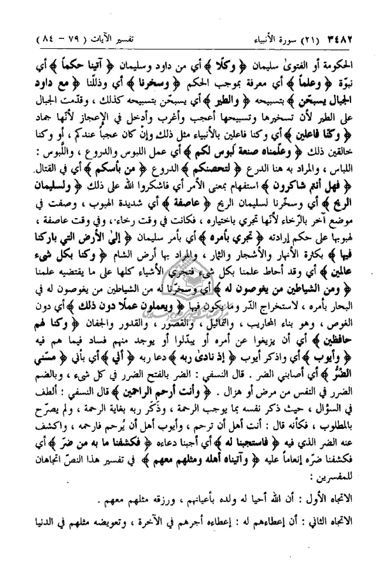 الحكومة أو الفتوى سليمان وَكُلًّا أي من داود وسليمان آتَيْنا حُكْماً أي نبوة وَعِلْماً أي معرفة بموجب الحكم وَسَخَّرْنا أي وذللنا مَعَ داوُدَ الْجِبالَ يُسَبِّحْنَ بتسبيحه وَالطَّيْرَ أي يسبحن بتسبيحه كذلك، وقدمت الجبال على الطير لأن تسخيرها وتسبيحها أعجب وأغرب وأدخل في الإعجاز لأنها جماد وَكُنَّا فاعِلِينَ أي وكنا فاعلين بالأنبياء مثل ذلك وإن كان عجبا عندكم، أو وكنا خالقين ذلك