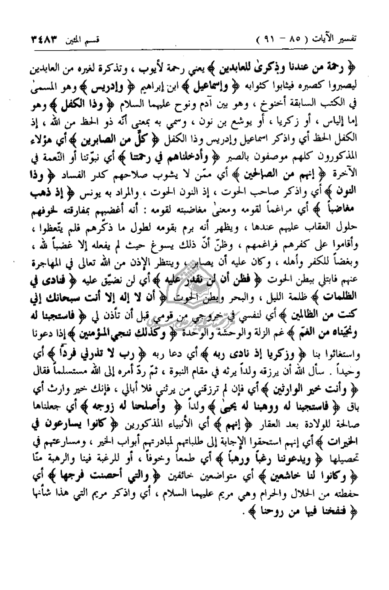 وَذَا النُّونِ أي واذكر صاحب الحوت، إذ النون الحوت، والمراد به يونس إِذْ ذَهَبَ مُغاضِباً أي مراغما لقومه ومعنى مغاضبته لقومه: أنه أغضبهم بمفارقته لخوفهم حلول العقاب عليهم عندها، ويظهر أنه برم بقومه لطول ما ذكرهم فلم يتعظوا، وأقاموا على كفرهم فراغمهم، وظن أن ذلك يسوغ حيث لم يفعله إلا غضبا لله، وبغضا للكفر وأهله، وكان عليه أن يصابر، وينتظر الإذن من الله تعالى في المهاجرة عنهم فابتلي ببطن الحوت فَظَنَّ أَنْ لَنْ نَقْدِرَ عَلَيْهِ أي لن نضيق عليه فَنادى فِي الظُّلُماتِ ظلمة الليل، والبحر وبطن الحوت أَنْ لا إِلهَ إِلَّا أَنْتَ سُبْحانَكَ إِنِّي كُنْتُ مِنَ الظَّالِمِينَ أي لنفسي في خروجي من قومي قبل أن تأذن لي