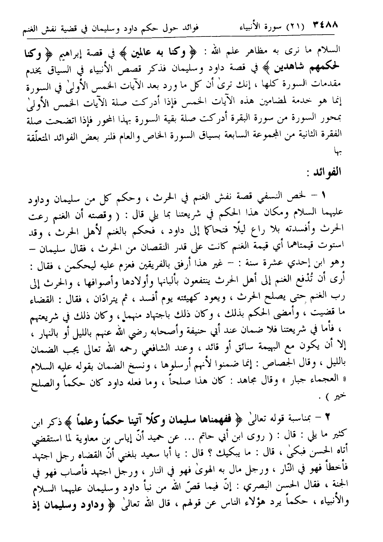 2 - بمناسبة قوله تعالى فَفَهَّمْناها سُلَيْمانَ وَكُلًّا آتَيْنا حُكْماً وَعِلْماً ذكر ابن كثير ما يلي: قال: (روى ابن أبي حاتم ... عن حميد أن إياس بن معاوية لما استقضي أتاه الحسن فبكى، قال: ما يبكيك؟ قال: يا أبا سعيد بلغني أن القضاة رجل اجتهد فأخطأ فهو في النار، ورجل مال به الهوى فهو في النار، ورجل اجتهد فأصاب فهو في الجنة، فقال الحسن البصري: إن فيما قص الله من نبأ داود وسليمان عليهما السلام والأنبياء، حكما يرد هؤلاء الناس عن قولهم، قال الله تعالى وَداوُدَ وَسُلَيْمانَ إِذْ