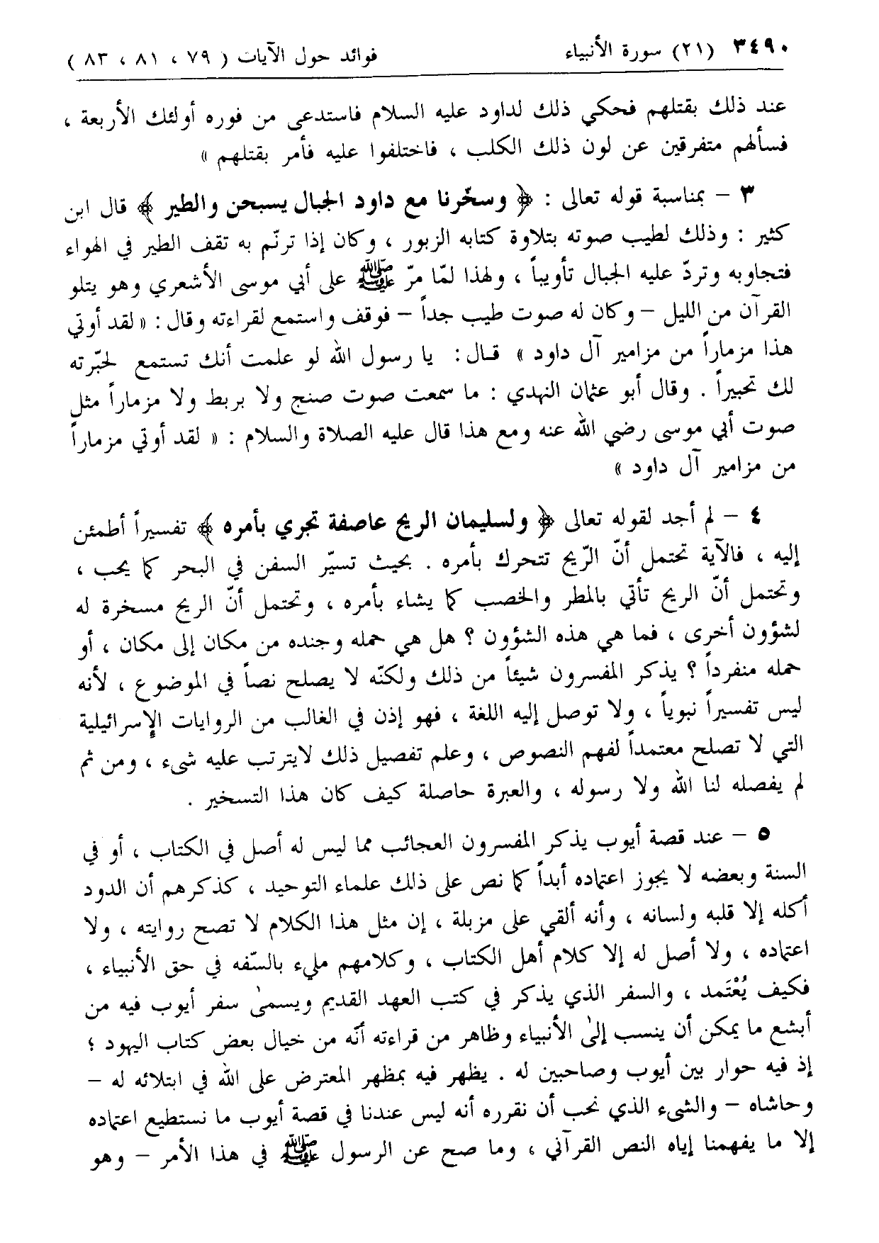 4 - لم أجد لقوله تعالى وَلِسُلَيْمانَ الرِّيحَ عاصِفَةً تَجْرِي بِأَمْرِهِ تفسيرا أطمئن إليه، فالآية تحتمل أن الريح تتحرك بأمره. بحيث تسير السفن في البحر كما يحب، وتحتمل أن الريح تأتي بالمطر والخصب كما يشاء بأمره، وتحتمل أن الريح مسخرة له لشئون أخرى، فما هي هذه الشئون؟ هل هي حمله وجنده من مكان إلى مكان، أو حمله منفردا؟ يذكر المفسرون شيئا من ذلك ولكنه لا يصلح نصا في الموضوع، لأنه ليس تفسيرا نبويا، ولا توصل إليه اللغة، فهو إذن في الغالب من الروايات الإسرائيلية التي لا تصلح معتمدا لفهم النصوص، وعلم تفصيل ذلك لا يترتب عليه شئ، ومن ثم لم يفصله لنا الله ولا رسوله، والعبرة حاصلة كيف كان هذا التسخير.