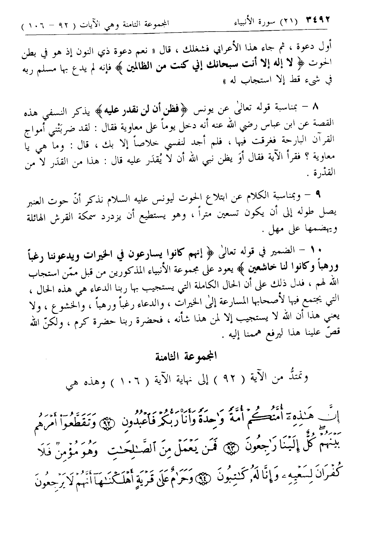 10 - الضمير في قوله تعالى إِنَّهُمْ كانُوا يُسارِعُونَ فِي الْخَيْراتِ وَيَدْعُونَنا رَغَباً وَرَهَباً وَكانُوا لَنا خاشِعِينَ يعود على مجموعة الأنبياء المذكورين من قبل ممن استجاب الله لهم، فدل ذلك على أن الحال الكاملة التي يستجيب بها ربنا الدعاء هي هذه الحال، التي يجتمع فيها لأصحابها المسارعة إلى الخيرات، والدعاء رغبا ورهبا، والخشوع، ولا يعني هذا أن الله لا يستجيب إلا لمن هذا شأنه، فحضرة ربنا حضرة كرم، ولكن الله قص علينا هذا ليرفع هممنا إليه.