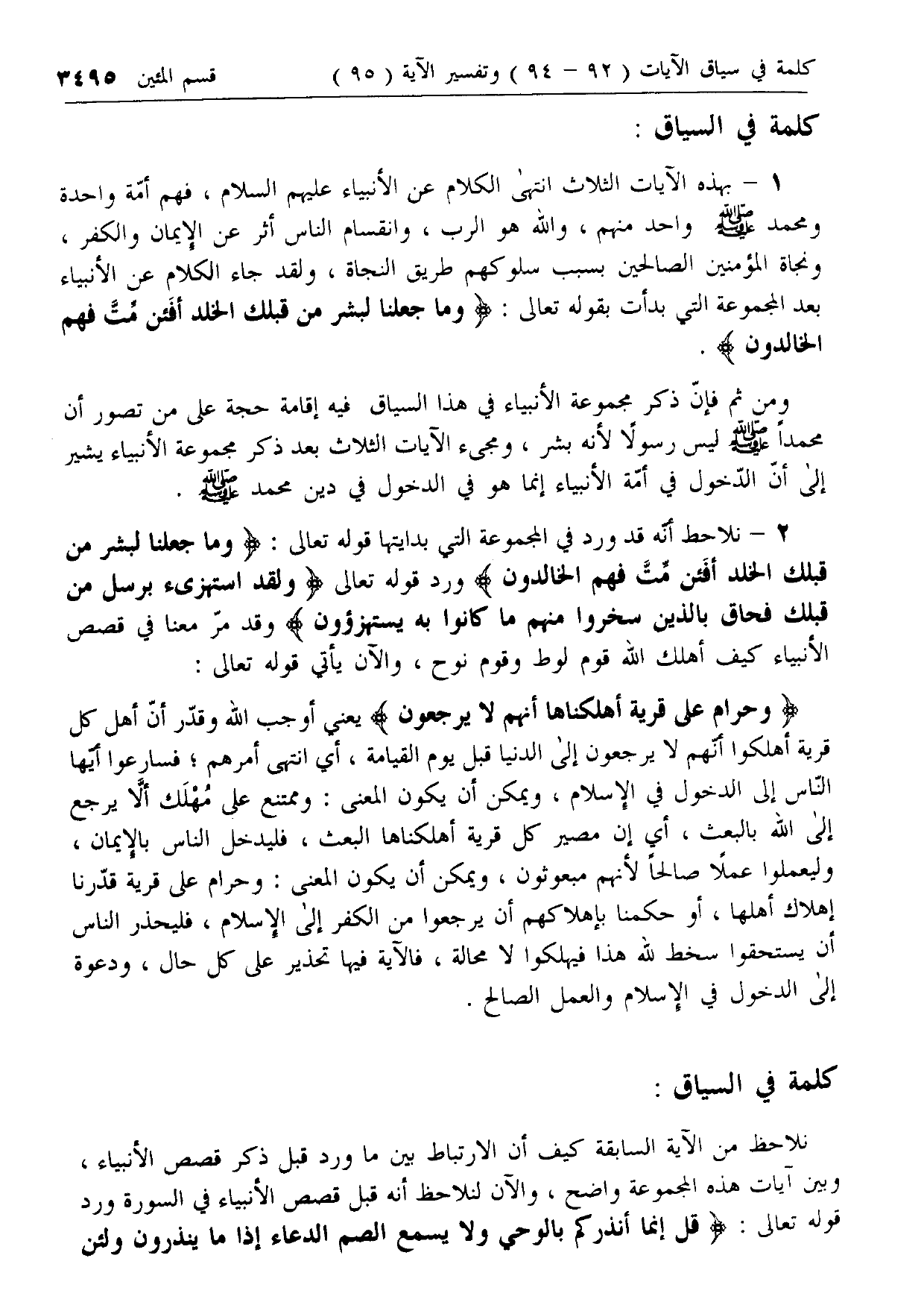 1 - بهذه الآيات الثلاث انتهى الكلام عن الأنبياء عليهم السلام، فهم أمة واحدة ومحمد صلى الله عليه وسلم واحد منهم، والله هو الرب، وانقسام الناس أثر عن الإيمان والكفر، ونجاة المؤمنين الصالحين بسبب سلوكهم طريق النجاة، ولقد جاء الكلام عن الأنبياء بعد المجموعة التي بدأت بقوله تعالى: وَما جَعَلْنا لِبَشَرٍ مِنْ قَبْلِكَ الْخُلْدَ أَفَإِنْ مِتَّ فَهُمُ الْخالِدُونَ.