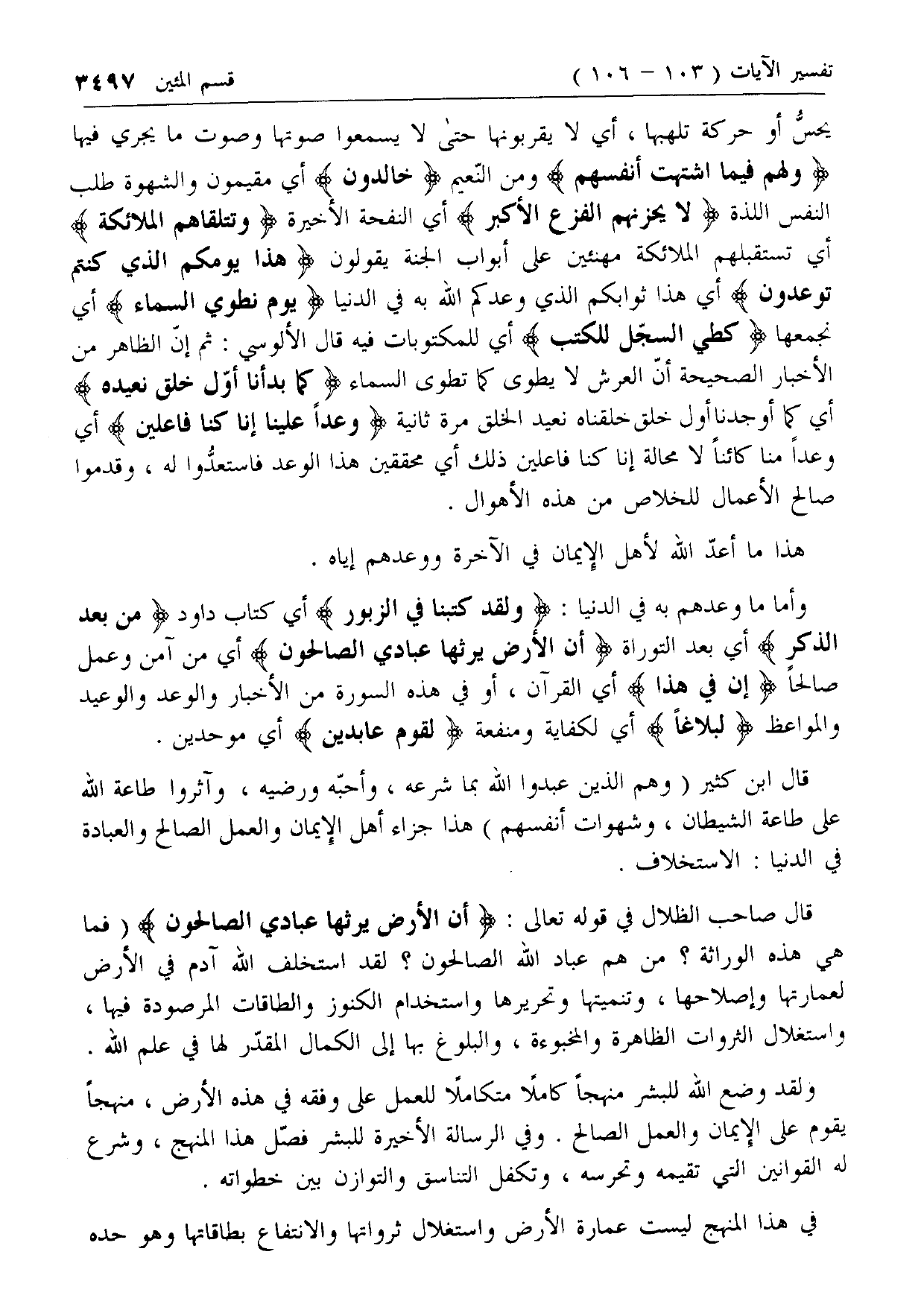 قال صاحب الظلال في قوله تعالى: أَنَّ الْأَرْضَ يَرِثُها عِبادِيَ الصَّالِحُونَ (فما هي هذه الوراثة؟ من هم عباد الله الصالحون؟ لقد استخلف الله آدم في الأرض لعمارتها