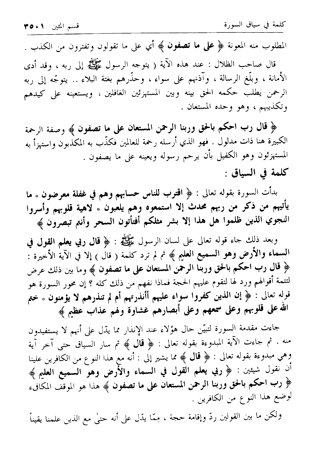جاءت مقدمة السورة لتبين حال هؤلاء عند الإنذار مما يدل على أنهم لا يستفيدون منه. ثم جاءت الآية المبدوءة بقوله تعالى: قالَ ثم سار السياق حتى آخر آية وهي مبدوءة بقوله تعالى: قالَ مما يشير إلى: أنه مع هذا النوع من الكافرين علينا أن نقول شيئين: رَبِّي يَعْلَمُ الْقَوْلَ فِي السَّماءِ وَالْأَرْضِ وَهُوَ السَّمِيعُ الْعَلِيمُ رَبِّ احْكُمْ بِالْحَقِّ وَرَبُّنَا الرَّحْمنُ الْمُسْتَعانُ عَلى ما تَصِفُونَ هذا هو الموقف المكافئ لوضع هذا النوع من الكافرين.