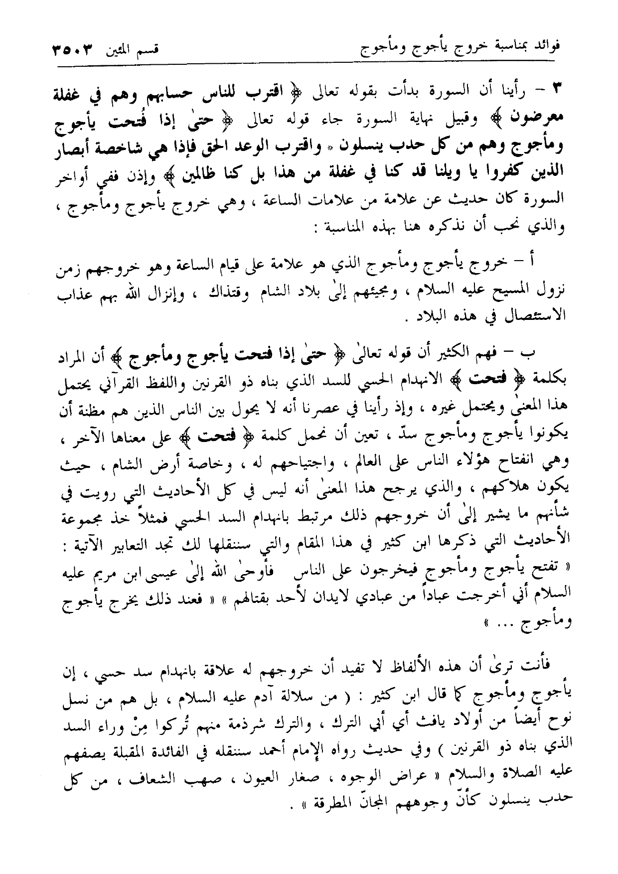 ب- فهم الكثير أن قوله تعالى حَتَّى إِذا فُتِحَتْ يَأْجُوجُ وَمَأْجُوجُ أن المراد بكلمة فُتِحَتْ الانهدام الحسي للسد الذي بناه ذو القرنين واللفظ القرآني يحتمل هذا المعنى ويحتمل غيره، وإذ رأينا في عصرنا أنه لا يحول بين الناس الذين هم مظنة أن يكونوا يأجوج ومأجوج سد، تعين أن نحمل كلمة فُتِحَتْ على معناها الآخر، وهي انفتاح هؤلاء الناس على العالم، واجتياحهم له، وخاصة أرض الشام، حيث يكون هلاكهم، والذي يرجح هذا المعنى أنه ليس في كل الأحاديث التي رويت في شأنهم ما يشير إلى أن خروجهم ذلك مرتبط بانهدام السد الحسي فمثلا خذ مجموعة الأحاديث التي ذكرها ابن كثير في هذا المقام والتي سننقلها لك تجد التعابير الآتية: