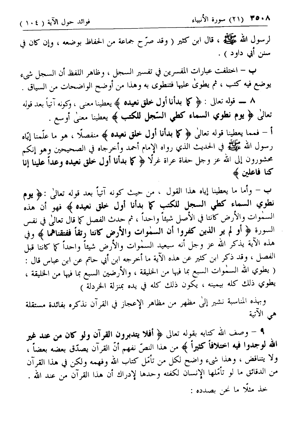 8 - قوله تعالى: كَما بَدَأْنا أَوَّلَ خَلْقٍ نُعِيدُهُ يعطينا معنى، وكونه آتيا بعد قوله تعالى يَوْمَ نَطْوِي السَّماءَ كَطَيِّ السِّجِلِّ لِلْكُتُبِ يعطينا معنى أوسع.