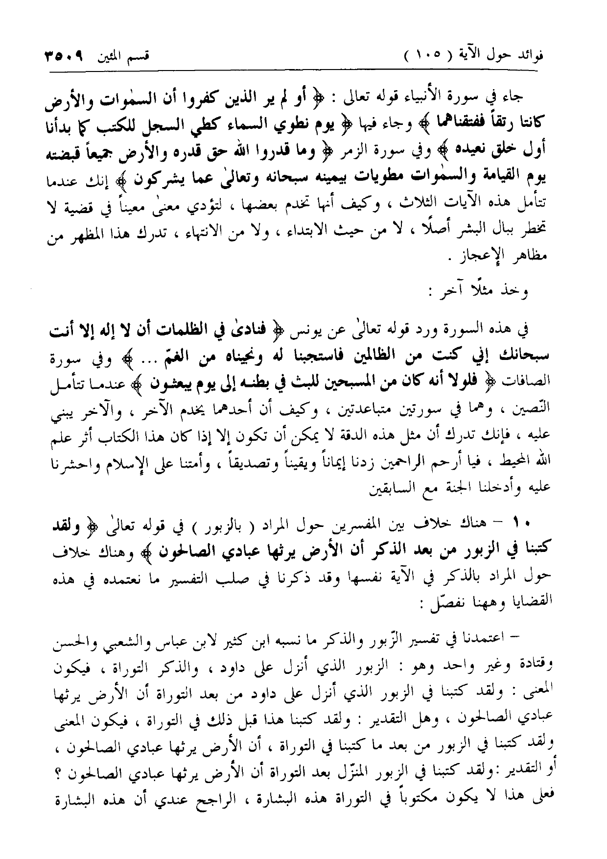 10 - هناك خلاف بين المفسرين حول المراد (بالزبور) في قوله تعالى وَلَقَدْ كَتَبْنا فِي الزَّبُورِ مِنْ بَعْدِ الذِّكْرِ أَنَّ الْأَرْضَ يَرِثُها عِبادِيَ الصَّالِحُونَ وهناك خلاف حول المراد بالذكر في الآية نفسها وقد ذكرنا في صلب التفسير ما نعتمده في هذه القضايا وهاهنا نفصل: