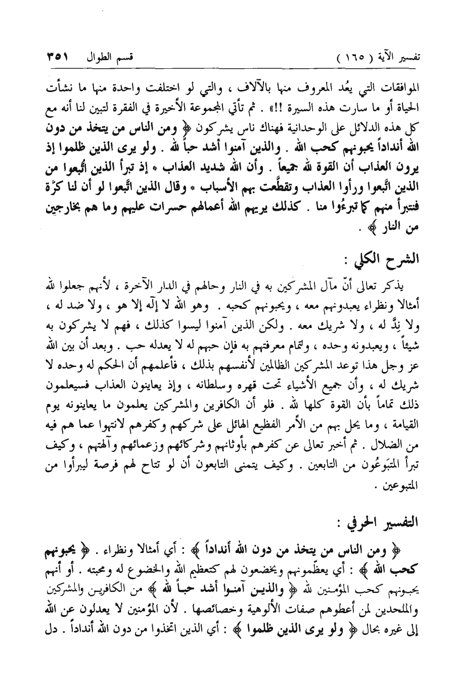 الموافقات التي يعد المعروف منها بالآلاف، والتي لو اختلفت واحدة منها ما نشأت الحياة أو ما سارت هذه السيرة!!». ثم تأتي المجموعة الأخيرة في الفقرة لتبين لنا أنه مع كل هذه الدلائل على الوحدانية فهناك ناس يشركون وَمِنَ النَّاسِ مَنْ يَتَّخِذُ مِنْ دُونِ اللَّهِ أَنْداداً يُحِبُّونَهُمْ كَحُبِّ اللَّهِ. وَالَّذِينَ آمَنُوا أَشَدُّ حُبًّا لِلَّهِ. وَلَوْ يَرَى الَّذِينَ ظَلَمُوا إِذْ يَرَوْنَ الْعَذابَ أَنَّ الْقُوَّةَ لِلَّهِ جَمِيعاً. وَأَنَّ اللَّهَ شَدِيدُ الْعَذابِ* إِذْ تَبَرَّأَ الَّذِينَ اتُّبِعُوا مِنَ الَّذِينَ اتَّبَعُوا وَرَأَوُا الْعَذابَ وَتَقَطَّعَتْ بِهِمُ الْأَسْبابُ* وَقالَ الَّذِينَ اتَّبَعُوا لَوْ أَنَّ لَنا كَرَّةً فَنَتَبَرَّأَ مِنْهُمْ كَما تَبَرَّؤُا مِنَّا. كَذلِكَ يُرِيهِمُ اللَّهُ أَعْمالَهُمْ حَسَراتٍ عَلَيْهِمْ وَما هُمْ بِخارِجِينَ مِنَ النَّارِ.