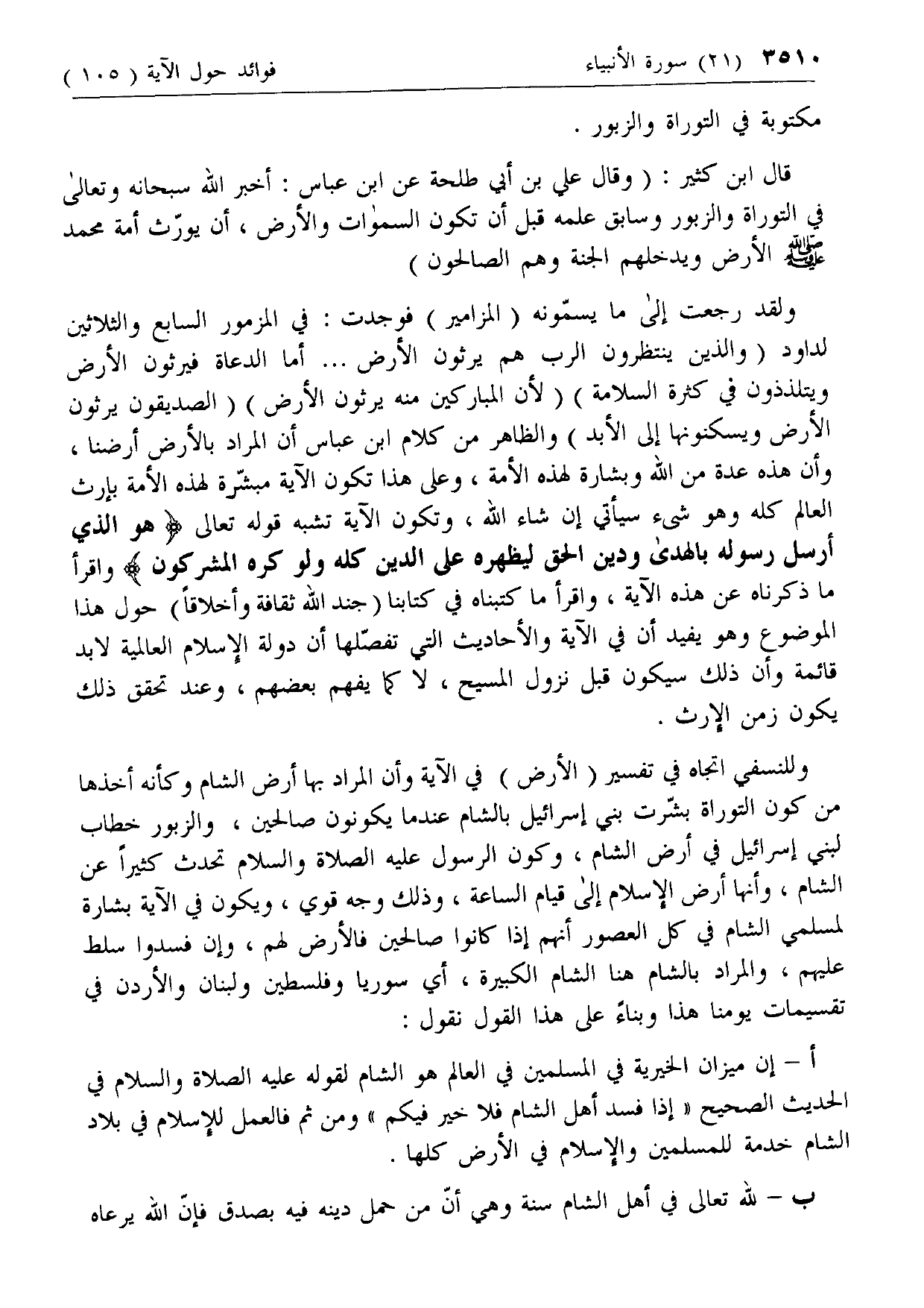ولقد رجعت إلى ما يسمونه (المزامير) فوجدت: في المزمور السابع والثلاثين لداود (والذين ينتظرون الرب هم يرثون الأرض ... أما الدعاة فيرثون الأرض ويتلذذون في كثرة السلامة) (لأن المباركين منه يرثون الأرض) (الصديقون يرثون الأرض ويسكنونها إلى الأبد) والظاهر من كلام ابن عباس أن المراد بالأرض أرضنا، وأن هذه عدة من الله وبشارة لهذه الأمة، وعلى هذا تكون الآية مبشرة لهذه الأمة بإرث العالم كله وهو شئ سيأتي إن شاء الله، وتكون الآية تشبه قوله تعالى هُوَ الَّذِي أَرْسَلَ رَسُولَهُ بِالْهُدى وَدِينِ الْحَقِّ لِيُظْهِرَهُ عَلَى الدِّينِ كُلِّهِ وَلَوْ كَرِهَ الْمُشْرِكُونَ* واقرأ ما ذكرناه عن هذه الآية، واقرأ ما كتبناه في كتابنا (جند الله ثقافة وأخلاقا) حول هذا الموضوع وهو يفيد أن في الآية والأحاديث التي تفصلها أن دولة الإسلام العالمية لا بد قائمة وأن ذلك سيكون قبل نزول المسيح، لا كما يفهم بعضهم، وعند تحقق ذلك يكون زمن الإرث.
