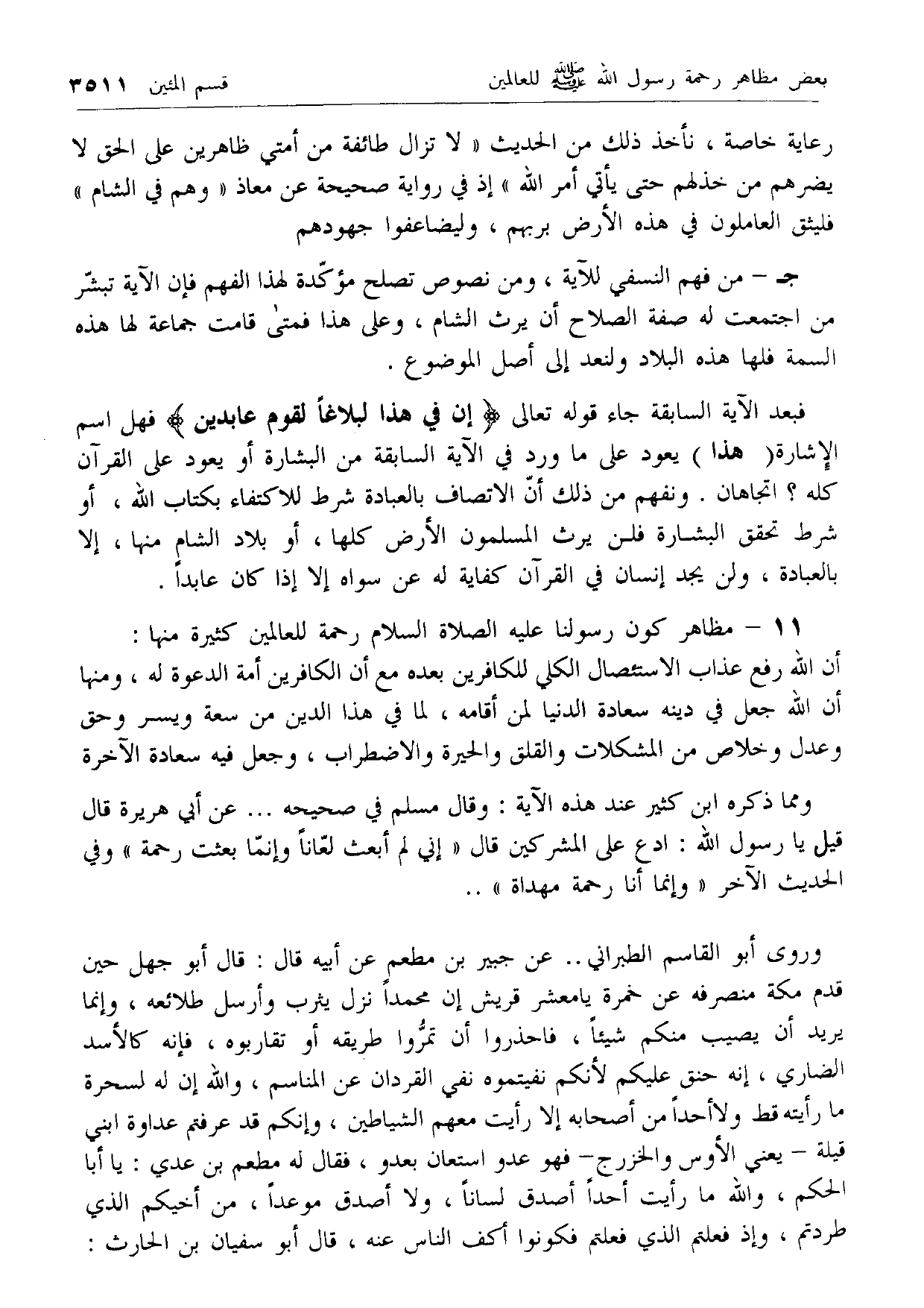 ومما ذكره ابن كثير عند هذه الآية: وقال مسلم في صحيحه ... عن أبي هريرة قال قيل يا رسول الله: ادع على المشركين قال «إني لم أبعث لعانا وإنما بعثت رحمة» وفي الحديث الآخر «وإنما أنا رحمة مهداة» ..
