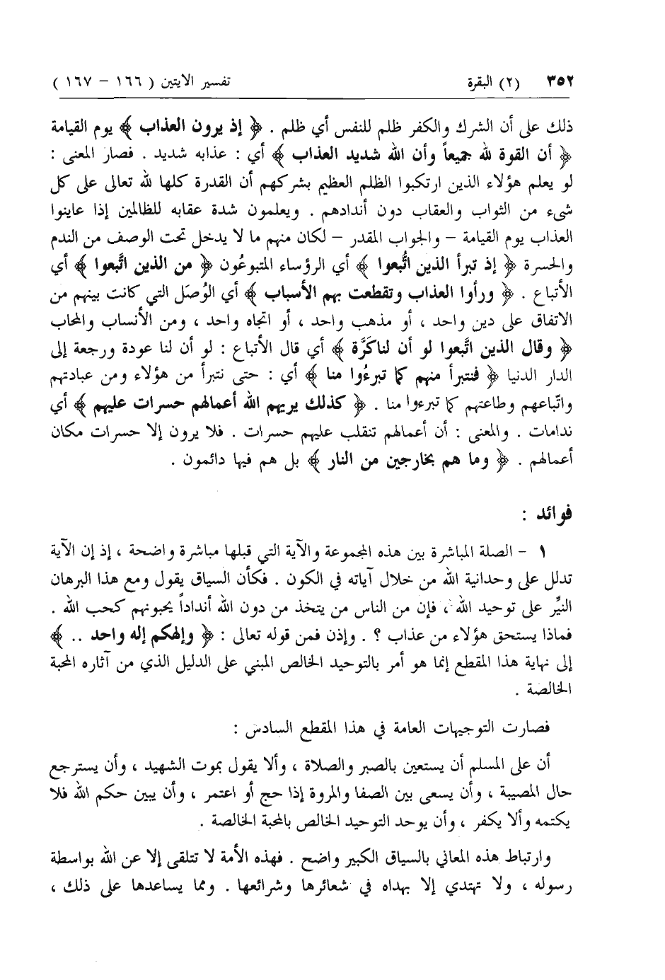 إِذْ تَبَرَّأَ الَّذِينَ اتُّبِعُوا أي الرؤساء المتبوعون مِنَ الَّذِينَ اتَّبَعُوا أي الأتباع. وَرَأَوُا الْعَذابَ وَتَقَطَّعَتْ بِهِمُ الْأَسْبابُ أي الوصل التي كانت بينهم من الاتفاق على دين واحد، أو مذهب واحد، أو اتجاه واحد، ومن الأنساب والمحاب