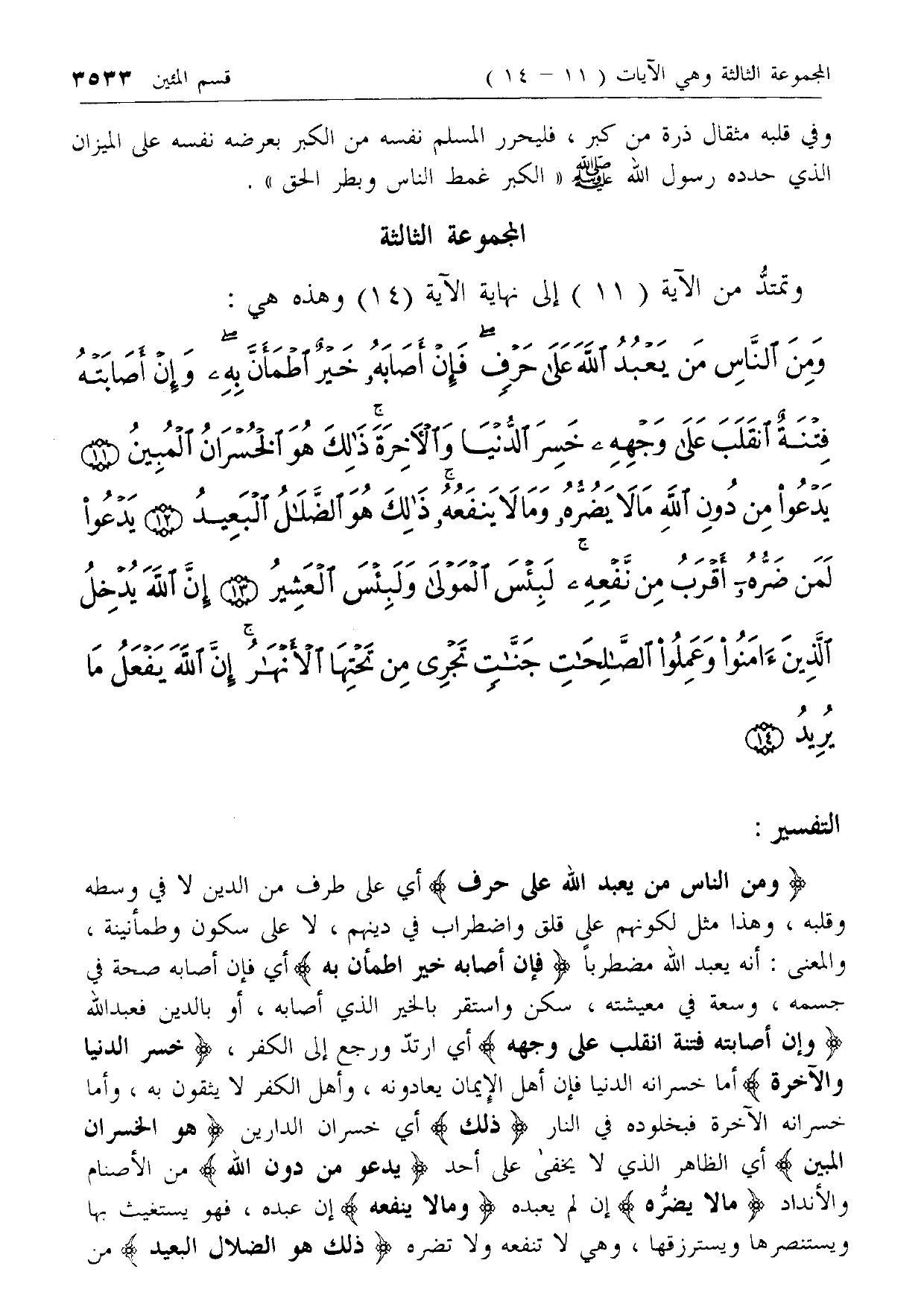 وَمِنَ النَّاسِ مَنْ يَعْبُدُ اللَّهَ عَلى حَرْفٍ فَإِنْ أَصابَهُ خَيْرٌ اطْمَأَنَّ بِهِ وَإِنْ أَصابَتْهُ فِتْنَةٌ انْقَلَبَ عَلى وَجْهِهِ خَسِرَ الدُّنْيا وَالْآخِرَةَ ذلِكَ هُوَ الْخُسْرانُ الْمُبِينُ (11) يَدْعُوا مِنْ دُونِ اللَّهِ ما لا يَضُرُّهُ وَما لا يَنْفَعُهُ ذلِكَ هُوَ الضَّلالُ الْبَعِيدُ (12) يَدْعُوا لَمَنْ ضَرُّهُ أَقْرَبُ مِنْ نَفْعِهِ لَبِئْسَ الْمَوْلى وَلَبِئْسَ الْعَشِيرُ (13) إِنَّ اللَّهَ يُدْخِلُ الَّذِينَ آمَنُوا وَعَمِلُوا الصَّالِحاتِ جَنَّاتٍ تَجْرِي مِنْ تَحْتِهَا الْأَنْهارُ إِنَّ اللَّهَ يَفْعَلُ ما يُرِيدُ (14)