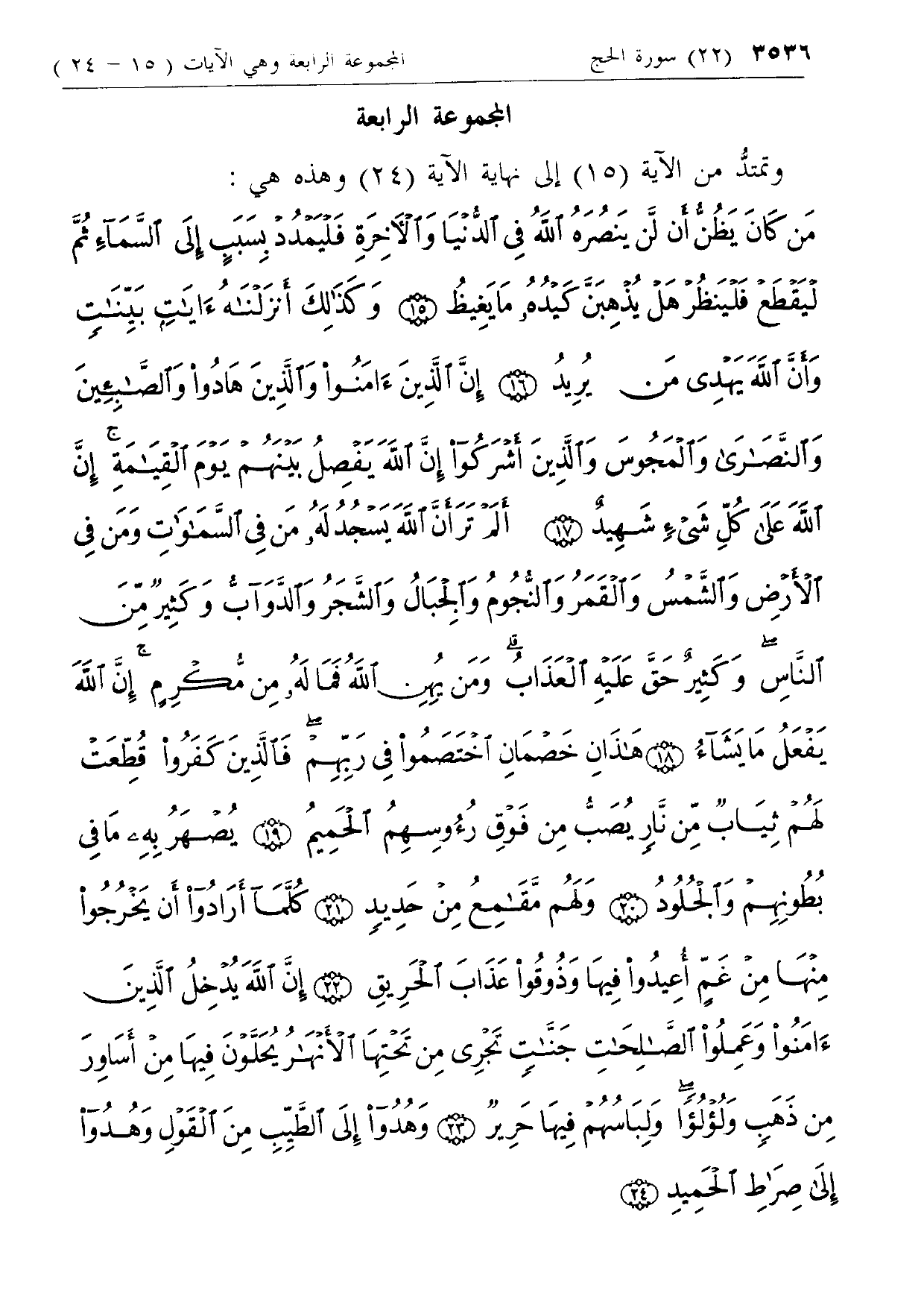 مَنْ كانَ يَظُنُّ أَنْ لَنْ يَنْصُرَهُ اللَّهُ فِي الدُّنْيا وَالْآخِرَةِ فَلْيَمْدُدْ بِسَبَبٍ إِلَى السَّماءِ ثُمَّ لْيَقْطَعْ فَلْيَنْظُرْ هَلْ يُذْهِبَنَّ كَيْدُهُ ما يَغِيظُ (15) وَكَذلِكَ أَنْزَلْناهُ آياتٍ بَيِّناتٍ وَأَنَّ اللَّهَ يَهْدِي مَنْ يُرِيدُ (16) إِنَّ الَّذِينَ آمَنُوا وَالَّذِينَ هادُوا وَالصَّابِئِينَ وَالنَّصارى وَالْمَجُوسَ وَالَّذِينَ أَشْرَكُوا إِنَّ اللَّهَ يَفْصِلُ بَيْنَهُمْ يَوْمَ الْقِيامَةِ إِنَّ اللَّهَ عَلى كُلِّ شَيْءٍ شَهِيدٌ (17) أَلَمْ تَرَ أَنَّ اللَّهَ يَسْجُدُ لَهُ مَنْ فِي السَّماواتِ وَمَنْ فِي الْأَرْضِ وَالشَّمْسُ وَالْقَمَرُ وَالنُّجُومُ وَالْجِبالُ وَالشَّجَرُ وَالدَّوَابُّ وَكَثِيرٌ مِنَ النَّاسِ وَكَثِيرٌ حَقَّ عَلَيْهِ الْعَذابُ وَمَنْ يُهِنِ اللَّهُ فَما لَهُ مِنْ مُكْرِمٍ إِنَّ اللَّهَ يَفْعَلُ ما يَشاءُ (18) هذانِ خَصْمانِ اخْتَصَمُوا فِي رَبِّهِمْ فَالَّذِينَ كَفَرُوا قُطِّعَتْ لَهُمْ ثِيابٌ مِنْ نارٍ يُصَبُّ مِنْ فَوْقِ رُؤُسِهِمُ الْحَمِيمُ (19)