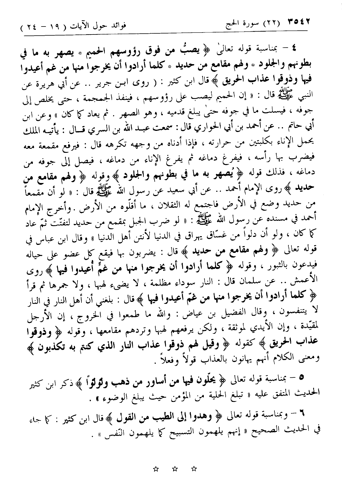 4 - بمناسبة قوله تعالى يُصَبُّ مِنْ فَوْقِ رُؤُسِهِمُ الْحَمِيمُ* يُصْهَرُ بِهِ ما فِي بُطُونِهِمْ وَالْجُلُودُ* وَلَهُمْ مَقامِعُ مِنْ حَدِيدٍ* كُلَّما أَرادُوا أَنْ يَخْرُجُوا مِنْها مِنْ غَمٍّ أُعِيدُوا فِيها وَذُوقُوا عَذابَ الْحَرِيقِ قال ابن كثير: (روى ابن جرير .. عن أبي هريرة عن النبي صلى الله عليه وسلم قال: «إن الحميم ليصب على رءوسهم، فينفذ الجمجمة، حتى يخلص إلى جوفه، فيسلت ما في جوفه حتى يبلغ قدميه، وهو الصهر. ثم يعاد كما كان» وعن ابن أبي حاتم .. عن أحمد بن أبي الحواري قال: سمعت عبد الله بن السري قال: يأتيه الملك يحمل الإناء بكلبتين من حرارته، فإذا أدناه من وجهه تكرهه قال: فيرفع مقمعة معه فيضرب بها رأسه، فيفرغ دماغه ثم يفرغ الإناء من دماغه، فيصل إلى جوفه من دماغه، فذلك قوله يُصْهَرُ بِهِ ما فِي بُطُونِهِمْ وَالْجُلُودُ وقوله وَلَهُمْ مَقامِعُ مِنْ حَدِيدٍ روى الإمام أحمد .. عن أبي سعيد عن رسول الله صلى الله عليه وسلم قال: «لو أن مقمعا من حديد وضع في الأرض فاجتمع له الثقلان، ما أقلوه من الأرض. وأخرج الإمام أحمد في مسنده عن رسول الله صلى الله عليه وسلم: «لو ضرب الجبل بمقمع من حديد لتفتت ثم عاد كما كان، ولو أن دلوا من غساق يهراق في الدنيا لأنتن أهل الدنيا» وقال ابن عباس في قوله تعالى وَلَهُمْ مَقامِعُ مِنْ حَدِيدٍ قال: يضربون بها فيقع كل عضو على حياله فيدعون بالثبور، وقوله كُلَّما أَرادُوا أَنْ يَخْرُجُوا مِنْها مِنْ غَمٍّ أُعِيدُوا فِيها روى الأعمش .. عن سلمان قال: النار سوداء مظلمة، لا يضيء لهبها، ولا جمرها ثم قرأ كُلَّما أَرادُوا أَنْ يَخْرُجُوا مِنْها مِنْ غَمٍّ أُعِيدُوا فِيها قال: بلغني أن أهل النار في النار لا يتنفسون، وقال الفضيل بن عياض: والله ما طمعوا في الخروج، إن الأرجل لمقيدة، وإن الأيدي لموثقة، ولكن يرفعهم لهبها وتردهم مقامعها، وقوله وَذُوقُوا عَذابَ الْحَرِيقِ كقوله وَقِيلَ لَهُمْ ذُوقُوا عَذابَ النَّارِ الَّذِي كُنْتُمْ بِهِ تُكَذِّبُونَ ومعنى الكلام أنهم يهانون بالعذاب قولا وفعلا.