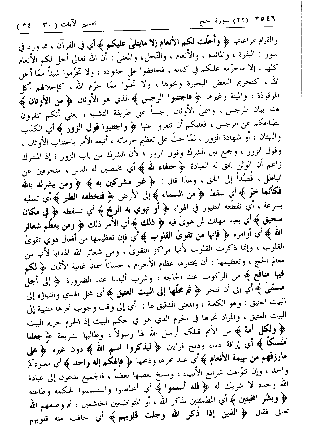 والقيام بمراعاتها وَأُحِلَّتْ لَكُمُ الْأَنْعامُ إِلَّا ما يُتْلى عَلَيْكُمْ أي في القرآن، مما ورد في سور: البقرة، والمائدة، والأنعام، والنحل، والمعنى: أن الله تعالى أحل لكم الأنعام كلها، إلا ما حرمه عليكم في كتابه، فحافظوا على حدوده، ولا تحرموا شيئا مما أحل الله، كتحريم البعض البحيرة ونحوها، ولا تحلوا مما حرم الله، كإحلالهم أكل الموقوذة، والميتة وغيرها فَاجْتَنِبُوا الرِّجْسَ الذي هو الأوثان مِنَ الْأَوْثانِ هذا بيان للرجس، وسمى الأوثان رجسا على طريقة التشبيه، يعني أنكم تنفرون بطباعكم عن الرجس، فعليكم أن تنفروا عنها وَاجْتَنِبُوا قَوْلَ الزُّورِ أي الكذب والبهتان، أو شهادة الزور، لما حث على تعظيم حرماته، أتبعه الأمر باجتناب الأوثان، وقول الزور، وجمع بين الشرك وقول الزور؛ لأن الشرك من باب الزور؛ إذ المشرك زاعم أن الوثن يحق له العبادة
