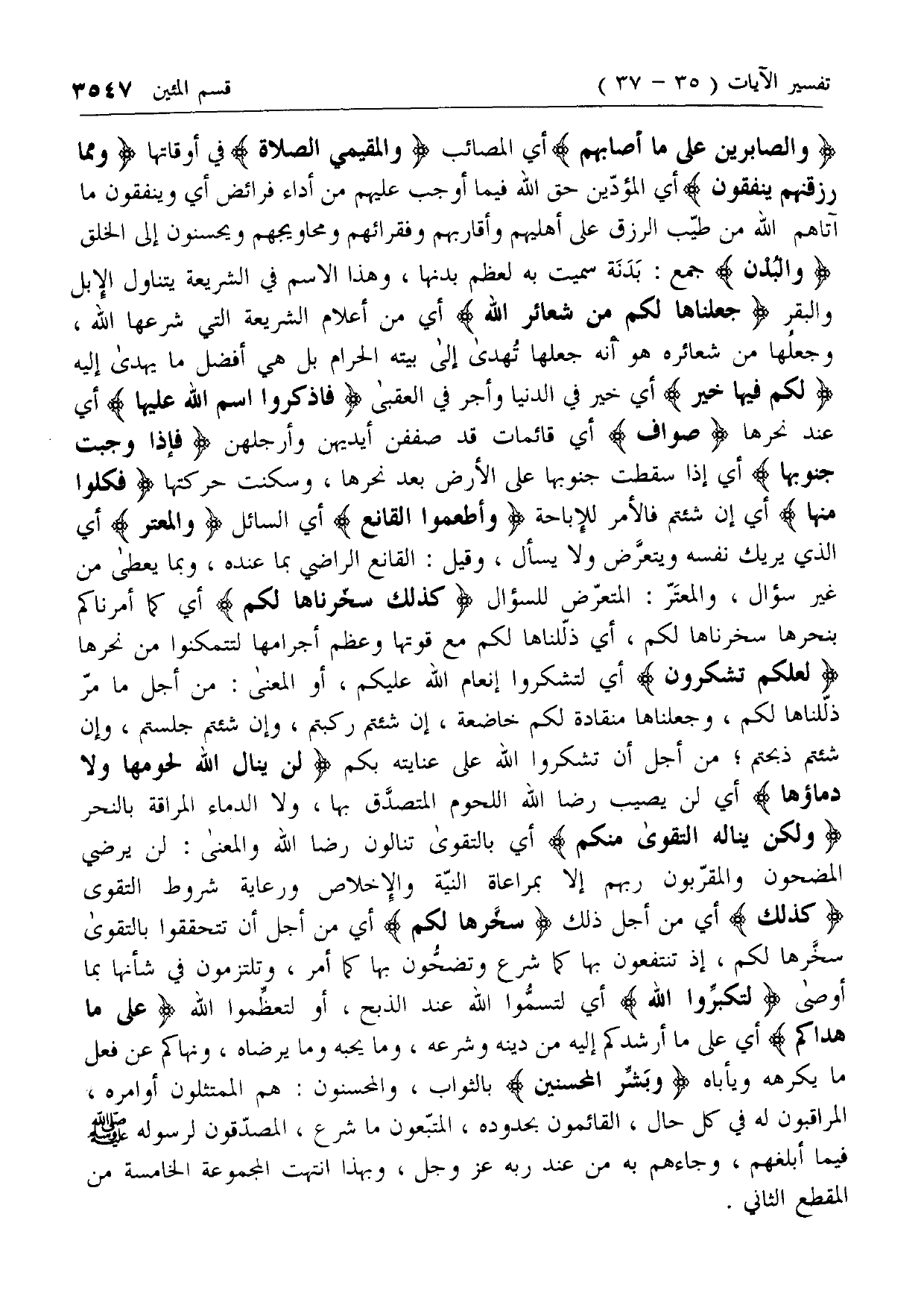 وَالْبُدْنَ جمع: بدنة سميت به لعظم بدنها، وهذا الاسم في الشريعة يتناول الإبل والبقر جَعَلْناها لَكُمْ مِنْ شَعائِرِ اللَّهِ أي من أعلام الشريعة التي شرعها الله، وجعلها من شعائره هو أنه جعلها تهدى إلى بيته الحرام بل هي أفضل ما يهدى إليه لَكُمْ فِيها خَيْرٌ أي خير في الدنيا وأجر في العقبى فَاذْكُرُوا اسْمَ اللَّهِ عَلَيْها أي عند نحرها صَوافَّ أي قائمات قد صففن أيديهن وأرجلهن فَإِذا وَجَبَتْ جُنُوبُها أي إذا سقطت جنوبها على الأرض بعد نحرها، وسكنت حركتها فَكُلُوا مِنْها أي إن شئتم فالأمر للإباحة وَأَطْعِمُوا الْقانِعَ أي السائل وَالْمُعْتَرَّ أي الذي يريك نفسه ويتعرض ولا يسأل، وقيل: القانع الراضي بما عنده، وبما يعطى من غير سؤال، والمعتر: المتعرض للسؤال كَذلِكَ سَخَّرْناها لَكُمْ أي كما أمرناكم بنحرها سخرناها لكم، أي ذللناها لكم مع قوتها وعظم أجرامها لتتمكنوا من نحرها لَعَلَّكُمْ تَشْكُرُونَ أي لتشكروا إنعام الله عليكم، أو المعنى: من أجل ما مر ذللناها لكم، وجعلناها منقادة لكم خاضعة، إن شئتم ركبتم، وإن شئتم جلستم، وإن شئتم ذبحتم؛ من أجل أن تشكروا الله على عنايته بكم