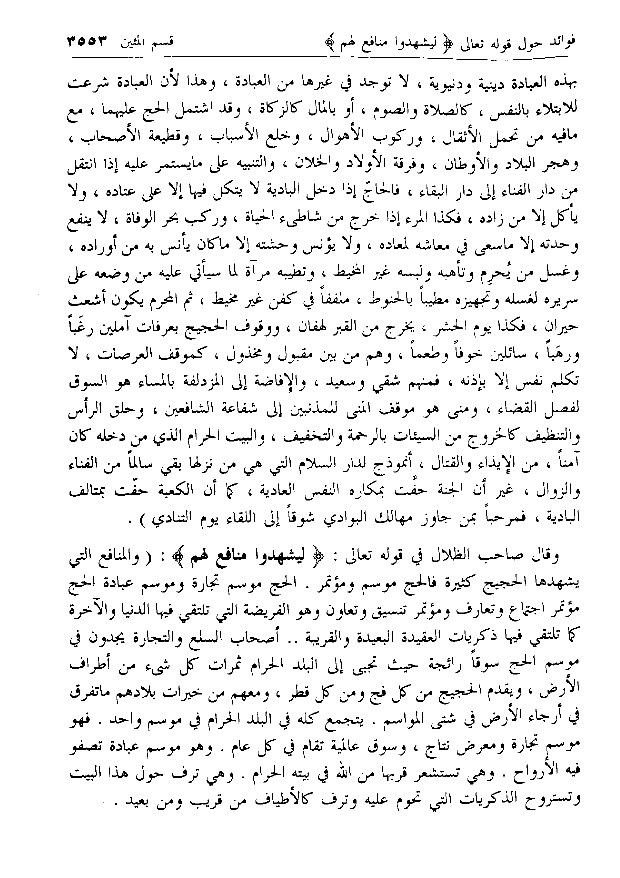 وقال صاحب الظلال في قوله تعالى: لِيَشْهَدُوا مَنافِعَ لَهُمْ: (والمنافع التي يشهدها الحجيج كثيرة فالحج موسم ومؤتمر. الحج موسم تجارة وموسم عبادة الحج مؤتمر اجتماع وتعارف ومؤتمر تنسيق وتعاون وهو الفريضة التي تلتقي فيها الدنيا والآخرة كما تلتقي فيها ذكريات العقيدة البعيدة والقريبة .. أصحاب السلع والتجارة يجدون في موسم الحج سوقا رائجة حيث تجبى إلى البلد الحرام ثمرات كل شئ من أطراف الأرض، ويقدم الحجيج من كل فج ومن كل قطر، ومعهم من خيرات بلادهم ما تفرق في أرجاء الأرض في شتى المواسم. يتجمع كله في البلد الحرام في موسم واحد. فهو موسم تجارة ومعرض نتاج، وسوق عالمية تقام في كل عام. وهو موسم عبادة تصفو فيه الأرواح. وهي تستشعر قربها من الله في بيته الحرام. وهي ترف حول هذا البيت وتستروح الذكريات التي تحوم عليه وترف كالأطياف من قريب ومن بعيد.