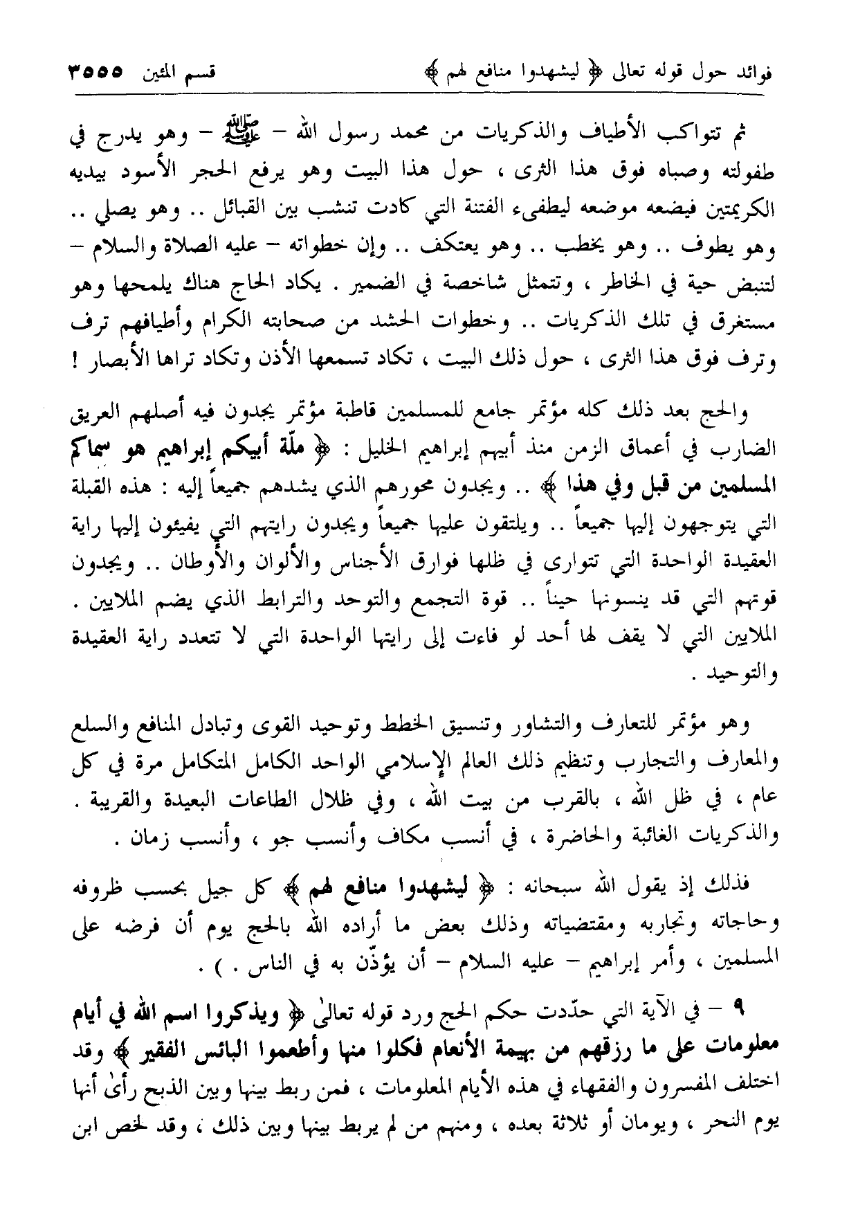 فذلك إذ يقول الله سبحانه: لِيَشْهَدُوا مَنافِعَ لَهُمْ كل جيل بحسب ظروفه وحاجاته وتجاربه ومقتضياته وذلك بعض ما أراده الله بالحج يوم أن فرضه على المسلمين، وأمر إبراهيم- عليه السلام- أن يؤذن به في الناس.).