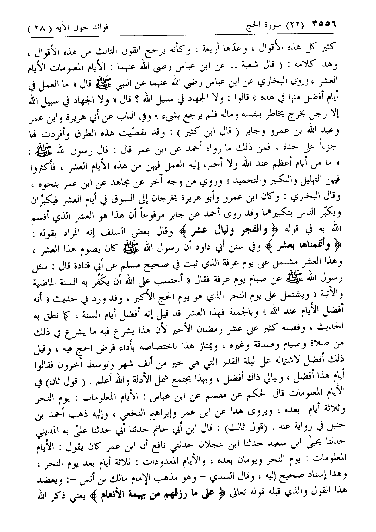 كثير كل هذه الأقوال، وعدها أربعة، وكأنه يرجح القول الثالث من هذه الأقوال، وهذا كلامه: (قال شعبة .. عن ابن عباس رضي الله عنهما: الأيام المعلومات الأيام العشر، وروى البخاري عن ابن عباس رضي الله عنهما عن النبي صلى الله عليه وسلم قال «ما العمل في أيام أفضل منها في هذه» قالوا: ولا الجهاد في سبيل الله؟ قال «ولا الجهاد في سبيل الله إلا رجل يخرج يخاطر بنفسه وماله فلم يرجع بشيء» وفي الباب عن أبي هريرة وابن عمر وعبد الله بن عمرو وجابر (قال ابن كثير): وقد تقصيت هذه الطرق وأفردت لها جزءا على حدة، فمن ذلك ما رواه أحمد عن ابن عمر قال: قال رسول الله صلى الله عليه وسلم: