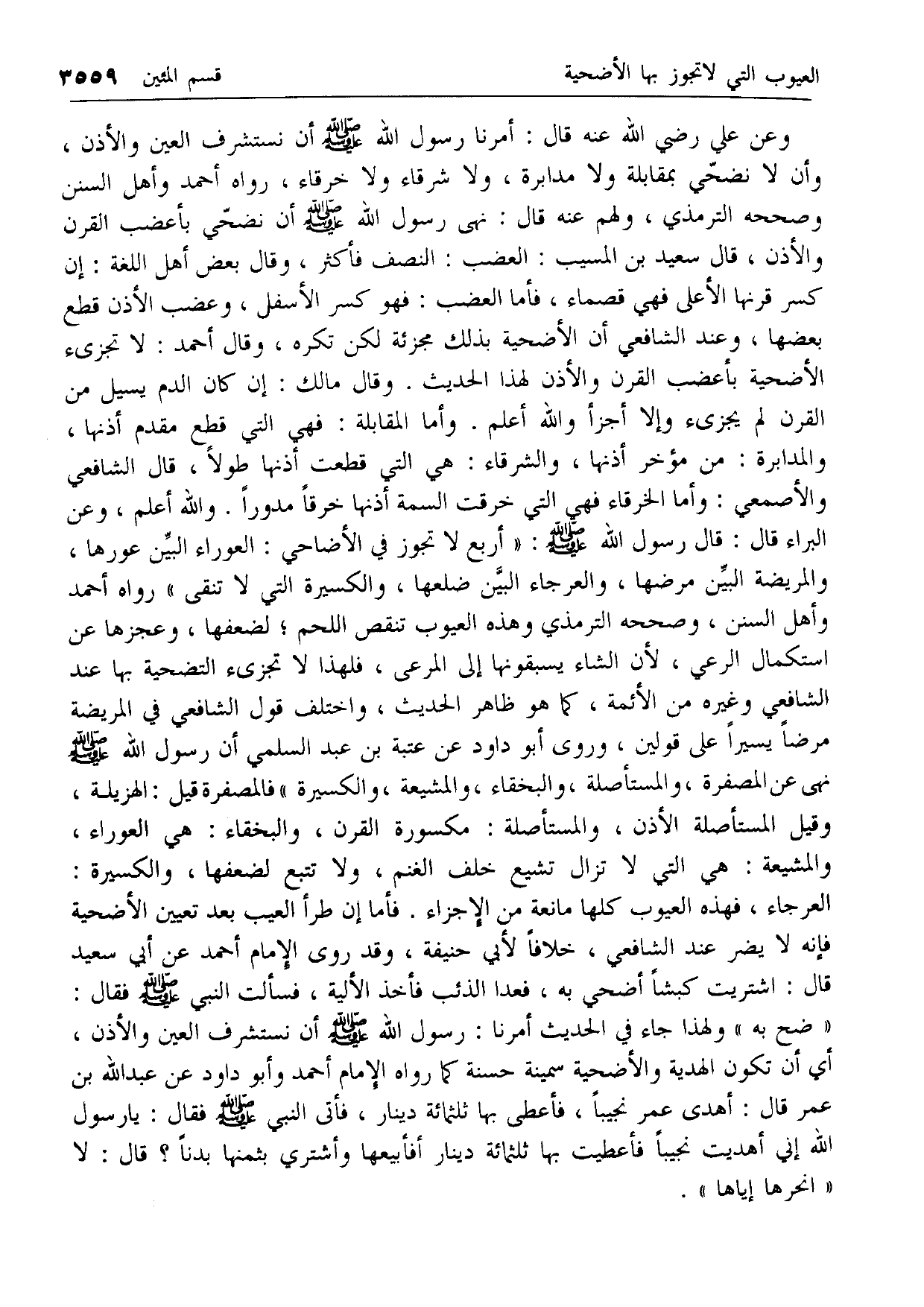 وعن علي رضي الله عنه قال: أمرنا رسول الله صلى الله عليه وسلم أن نستشرف العين والأذن، وأن لا نضحي بمقابلة ولا مدابرة، ولا شرقاء ولا خرقاء، رواه أحمد وأهل السنن وصححه الترمذي، ولهم عنه قال: نهى رسول الله صلى الله عليه وسلم أن نضحي بأعضب القرن والأذن، قال سعيد بن المسيب: العضب: النصف فأكثر، وقال بعض أهل اللغة: إن كسر قرنها الأعلى فهي قصماء، فأما العضب: فهو كسر الأسفل، وعضب الأذن قطع بعضها، وعند الشافعي أن الأضحية بذلك مجزئة لكن تكره، وقال أحمد: لا تجزئ الأضحية بأعضب القرن والأذن لهذا الحديث. وقال مالك: إن كان الدم يسيل من القرن لم يجزئ وإلا أجزأ والله أعلم. وأما المقابلة: فهي التي قطع مقدم أذنها، والمدابرة: من مؤخر أذنها، والشرقاء: هي التي قطعت أذنها طولا، قال الشافعي والأصمعي: وأما الخرقاء فهي التي خرقت السمة أذنها خرقا مدورا. والله أعلم، وعن البراء قال: قال رسول الله صلى الله عليه وسلم: «أربع لا تجوز في الأضاحي: العوراء البين عورها، والمريضة البين مرضها، والعرجاء البين ضلعها، والكسيرة التي لا تنقى» رواه أحمد وأهل السنن، وصححه الترمذي وهذه العيوب تنقص اللحم؛ لضعفها، وعجزها عن استكمال الرعي، لأن الشاء يسبقونها إلى المرعى، فلهذا لا تجزئ