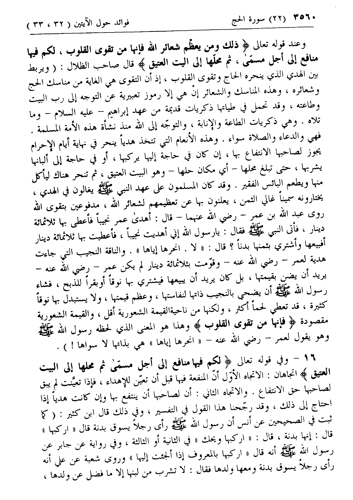 16 - وفي قوله تعالى لَكُمْ فِيها مَنافِعُ إِلى أَجَلٍ مُسَمًّى ثُمَّ مَحِلُّها إِلَى الْبَيْتِ الْعَتِيقِ اتجاهان: الاتجاه الأول أن المنفعة فيها قبل أن تعين للإهداء، فإذا تعينت لم يبق لصاحبها حق الانتفاع. والاتجاه الثاني: أن لصاحبها أن ينتفع بها وإن كانت هديا إذا احتاج إلى ذلك، وقد رجحنا هذا القول في التفسير، وفي ذلك قال ابن كثير: (كما ثبت في الصحيحين عن أنس أن رسول الله صلى الله عليه وسلم رأى رجلا يسوق بدنة قال «اركبها» قال: إنها بدنة، قال: «اركبها ويحك» في الثانية أو الثالثة، وفي رواية عن جابر عن رسول الله صلى الله عليه وسلم أنه قال «اركبها بالمعروف إذا ألجئت إليها» وروى شعبة عن علي أنه رأى رجلا يسوق بدنة ومعها ولدها فقال: لا تشرب من لبنها إلا ما فضل عن ولدها،