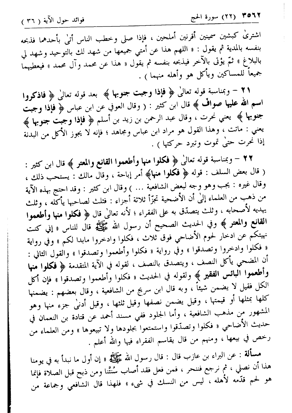 21 - وبمناسبة قوله تعالى فَإِذا وَجَبَتْ جُنُوبُها بعد قوله تعالى فَاذْكُرُوا اسْمَ اللَّهِ عَلَيْها صَوافَّ قال ابن كثير: (وقال العوفي عن ابن عباس فَإِذا وَجَبَتْ جُنُوبُها يعني نحرت، وقال عبد الرحمن بن زيد بن أسلم فَإِذا وَجَبَتْ جُنُوبُها يعني: ماتت، وهذا القول هو مراد ابن عباس ومجاهد؛ فإنه لا يجوز الأكل من البدنة إذا نحرت حتى تموت وتبرد حركتها).