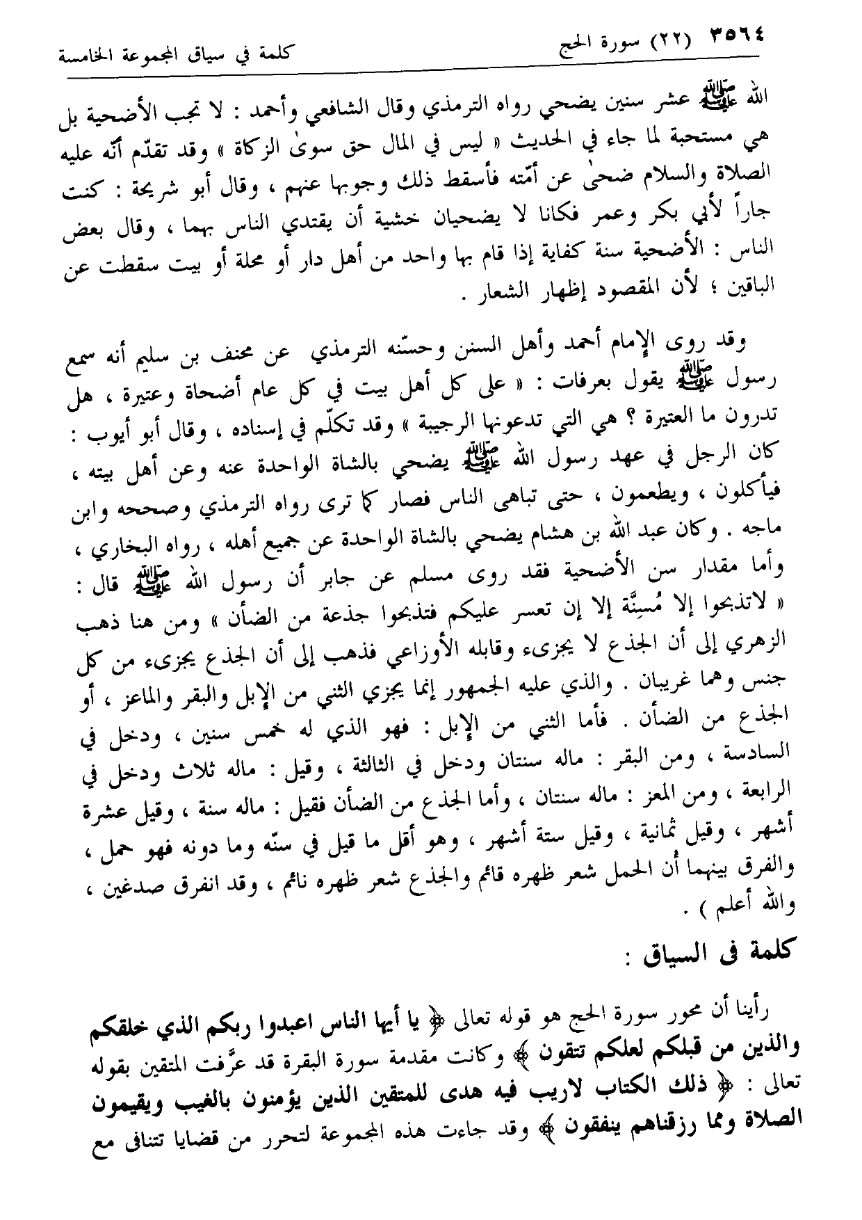 «لا تذبحوا إلا مسنة إلا إن تعسر عليكم فتذبحوا جذعة من الضأن» ومن هنا ذهب الزهري إلى أن الجذع لا يجزئ وقابله الأوزاعي فذهب إلى أن الجذع يجزئ من كل جنس وهما غريبان. والذي عليه الجمهور إنما يجزي الثني من الإبل والبقر والماعز، أو الجذع من الضأن. فأما الثني من الإبل: فهو الذي له خمس سنين، ودخل في السادسة، ومن البقر: ما له سنتان ودخل في الثالثة، وقيل: ما له ثلاث ودخل في الرابعة، ومن المعز: ما له سنتان، وأما الجذع من الضأن فقيل: ما له سنة، وقيل عشرة أشهر، وقيل ثمانية، وقيل ستة أشهر، وهو أقل ما قيل في سنه وما دونه فهو حمل، والفرق بينهما أن الحمل شعر ظهره قائم والجذع شعر ظهره نائم، وقد انفرق صدغين، والله أعلم).