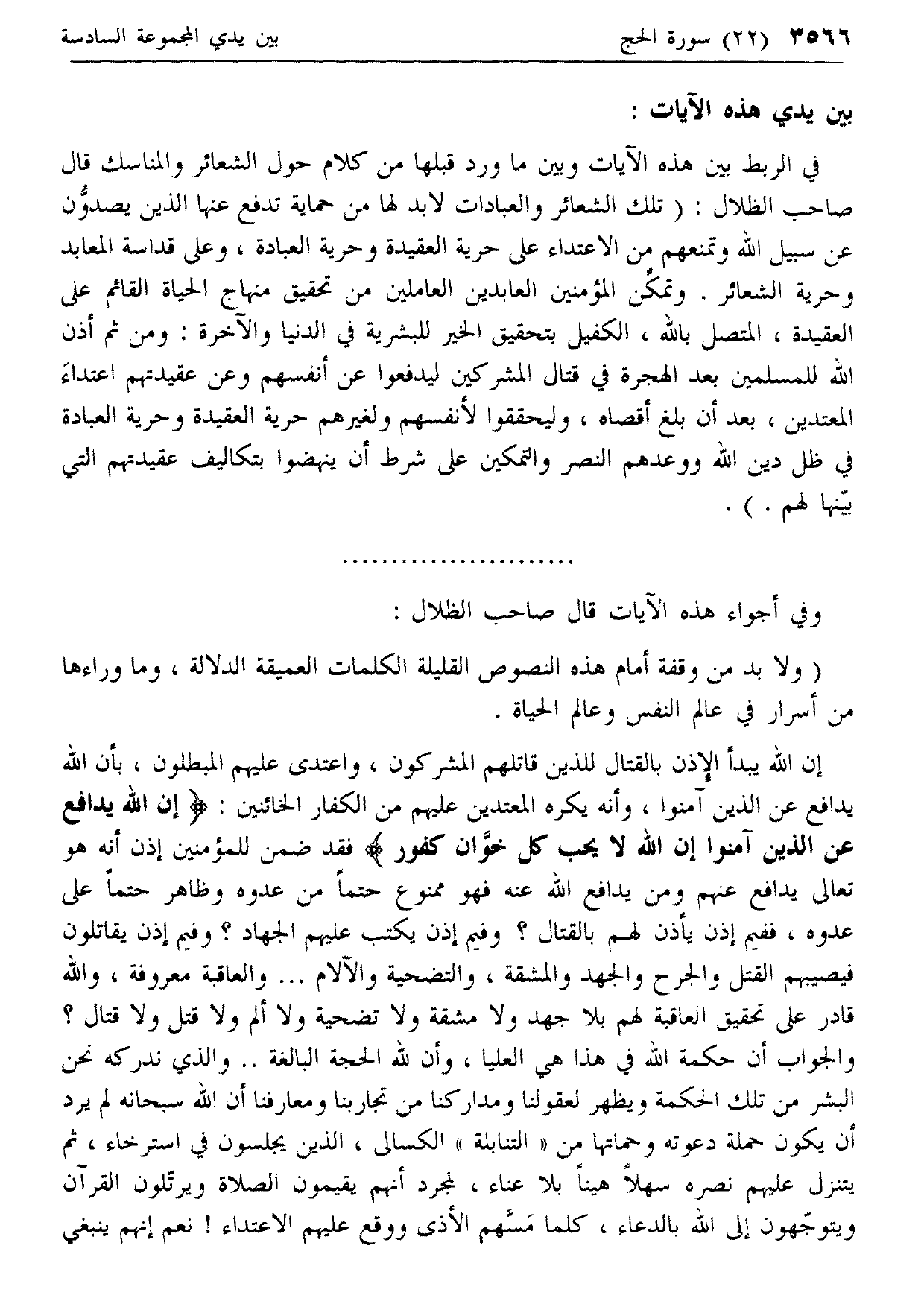 في الربط بين هذه الآيات وبين ما ورد قبلها من كلام حول الشعائر والمناسك قال صاحب الظلال: (تلك الشعائر والعبادات لا بد لها من حماية تدفع عنها الذين يصدون عن سبيل الله وتمنعهم من الاعتداء على حرية العقيدة وحرية العبادة، وعلى قداسة المعابد وحرية الشعائر. وتمكن المؤمنين العابدين العاملين من تحقيق منهاج الحياة القائم على العقيدة، المتصل بالله، الكفيل بتحقيق الخير للبشرية في الدنيا والآخرة: ومن ثم أذن الله للمسلمين بعد الهجرة في قتال المشركين ليدفعوا عن أنفسهم وعن عقيدتهم اعتداء المعتدين، بعد أن بلغ أقصاه، وليحققوا لأنفسهم ولغيرهم حرية العقيدة وحرية العبادة في ظل دين الله ووعدهم النصر والتمكين على شرط أن ينهضوا بتكاليف عقيدتهم التي بينها لهم.).
