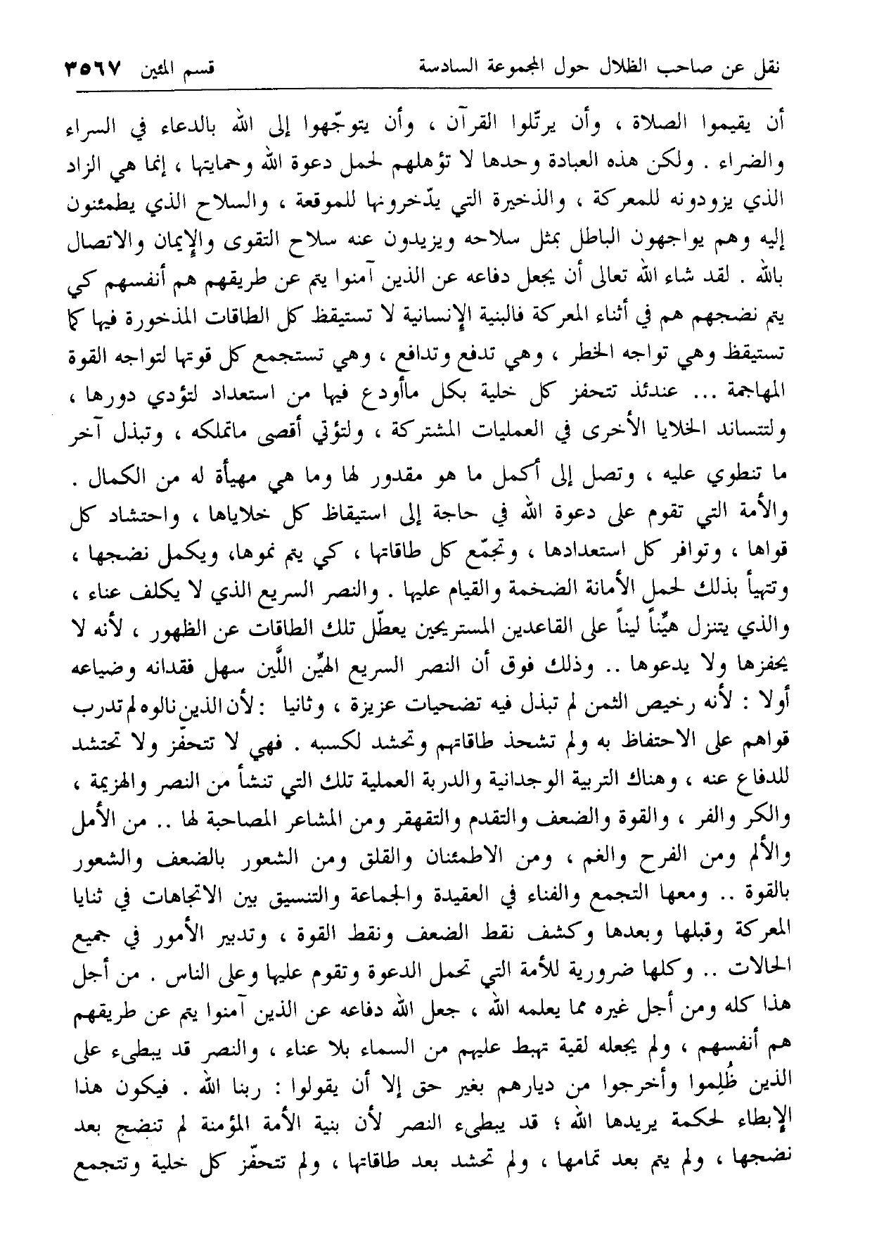 أن يقيموا الصلاة، وأن يرتلوا القرآن، وأن يتوجهوا إلى الله بالدعاء في السراء والضراء. ولكن هذه العبادة وحدها لا تؤهلهم لحمل دعوة الله وحمايتها، إنما هي الزاد الذي يزودونه للمعركة، والذخيرة التي يدخرونها للموقعة، والسلاح الذي يطمئنون إليه وهم يواجهون الباطل بمثل سلاحه ويزيدون عنه سلاح التقوى والإيمان والاتصال بالله. لقد شاء الله تعالى أن يجعل دفاعه عن الذين آمنوا يتم عن طريقهم هم أنفسهم كي يتم نضجهم هم في أثناء المعركة فالبنية الإنسانية لا تستيقظ كل الطاقات المذخورة فيها كما تستيقظ وهي تواجه الخطر، وهي تدفع وتدافع، وهي تستجمع كل قوتها لتواجه القوة المهاجمة ... عندئذ تتحفز كل خلية بكل ما أودع فيها من استعداد لتؤدي دورها، ولتتساند الخلايا الأخرى في العمليات المشتركة، ولتؤتي أقصى ما تملكه، وتبذل آخر ما تنطوي عليه، وتصل إلى أكمل ما هو مقدور لها وما هي مهيأة له من الكمال.