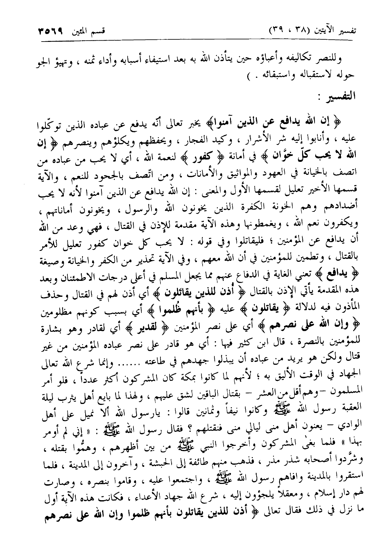 أُذِنَ لِلَّذِينَ يُقاتَلُونَ أي أذن لهم في القتال وحذف المأذون فيه لدلالة يُقاتَلُونَ عليه بِأَنَّهُمْ ظُلِمُوا أي بسبب كونهم مظلومين وَإِنَّ اللَّهَ عَلى نَصْرِهِمْ أي على نصر المؤمنين لَقَدِيرٌ أي لقادر وهو بشارة للمؤمنين بالنصرة، قال ابن كثير فيها: أي هو قادر على نصر عباده المؤمنين من غير قتال ولكن هو يريد من عباده أن يبذلوا جهدهم في طاعته ...... وإنما شرع الله تعالى الجهاد في الوقت الأليق به؛ لأنهم لما كانوا بمكة كان المشركون أكثر عددا، فلو أمر المسلمون- وهم أقل من العشر- بقتال الباقين لشق عليهم، ولهذا لما بايع أهل يثرب ليلة العقبة رسول الله صلى الله عليه وسلم وكانوا نيفا وثمانين قالوا: يا رسول الله ألا نميل على أهل الوادي- يعنون أهل منى ليالي منى فنقتلهم؟ فقال رسول الله صلى الله عليه وسلم: «إني لم أومر بهذا» فلما بغى المشركون وأخرجوا النبي صلى الله عليه وسلم من بين أظهرهم، وهموا بقتله، وشردوا أصحابه شذر مذر، فذهب منهم طائفة إلى الحبشة، وآخرون إلى المدينة، فلما استقروا بالمدينة وافاهم رسول الله صلى الله عليه وسلم، واجتمعوا عليه، وقاموا بنصره، وصارت لهم دار إسلام، ومعقلا يلجئون إليه، شرع الله جهاد الأعداء، فكانت هذه الآية أول ما نزل في ذلك فقال تعالى أُذِنَ لِلَّذِينَ يُقاتَلُونَ بِأَنَّهُمْ ظُلِمُوا وَإِنَّ اللَّهَ عَلى نَصْرِهِمْ
