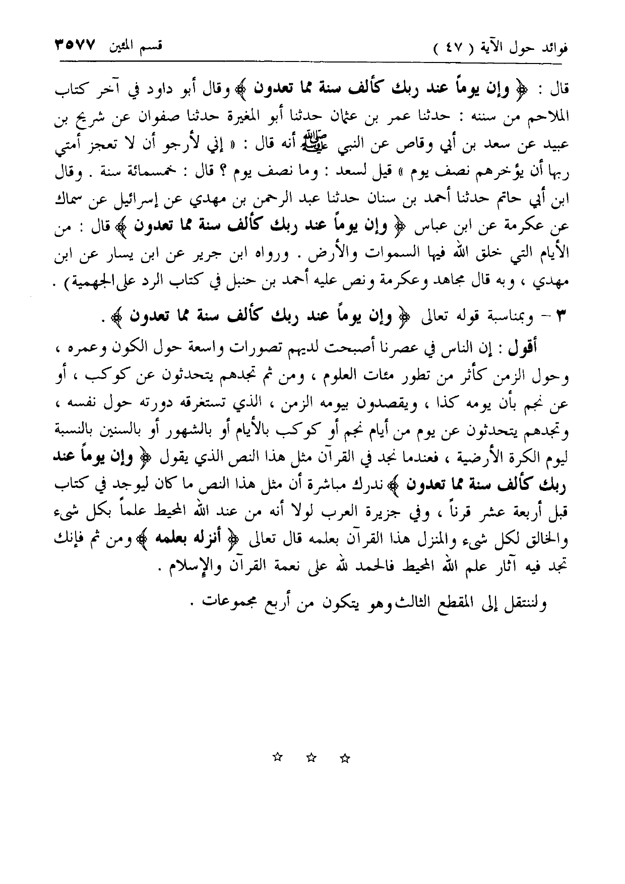 3 - وبمناسبة قوله تعالى وَإِنَّ يَوْماً عِنْدَ رَبِّكَ كَأَلْفِ سَنَةٍ مِمَّا تَعُدُّونَ.