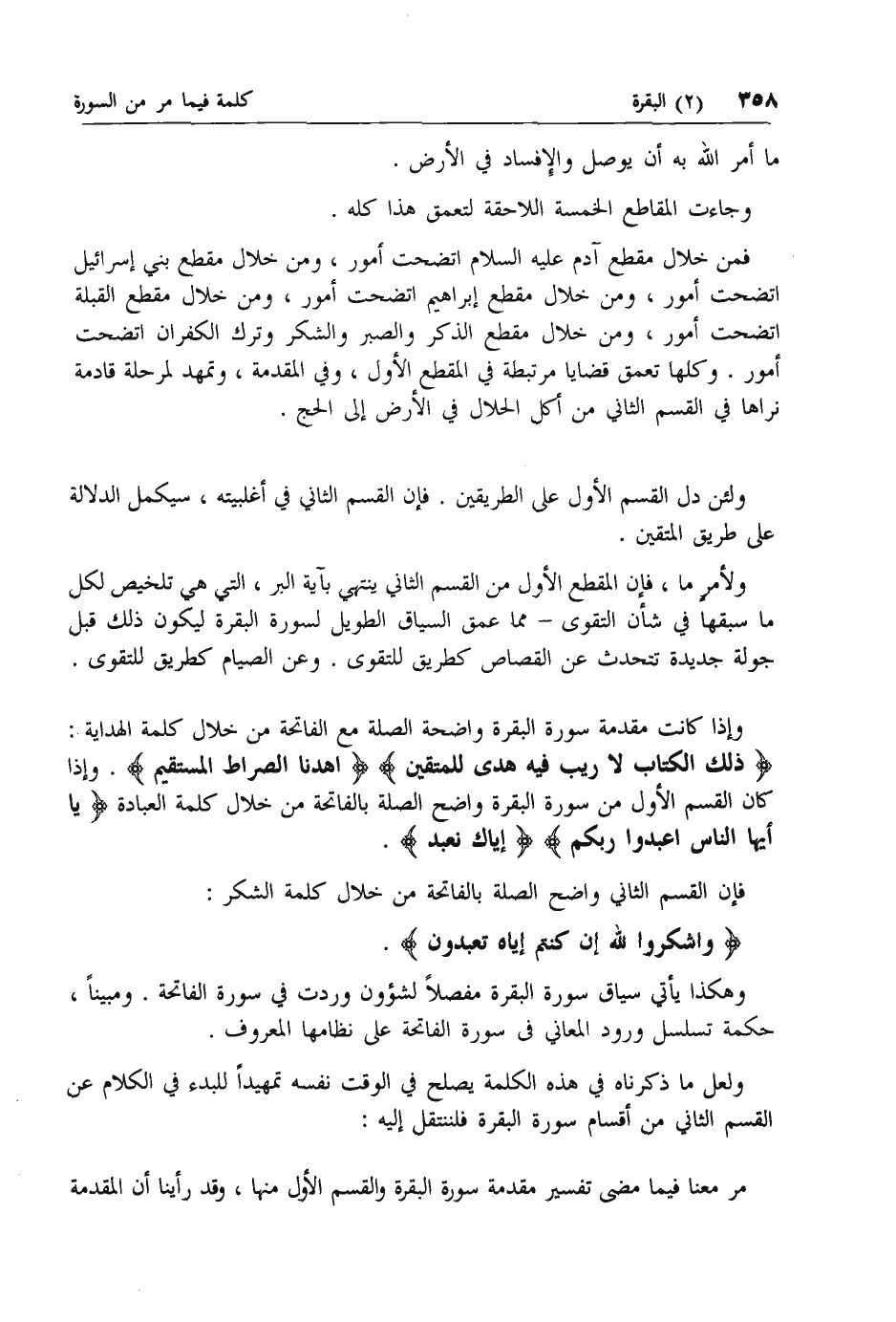 ذلِكَ الْكِتابُ لا رَيْبَ فِيهِ هُدىً لِلْمُتَّقِينَ اهْدِنَا الصِّراطَ الْمُسْتَقِيمَ. وإذا كان القسم الأول من سورة البقرة واضح الصلة بالفاتحة من خلال كلمة العبادة يا أَيُّهَا النَّاسُ اعْبُدُوا رَبَّكُمُ إِيَّاكَ نَعْبُدُ.