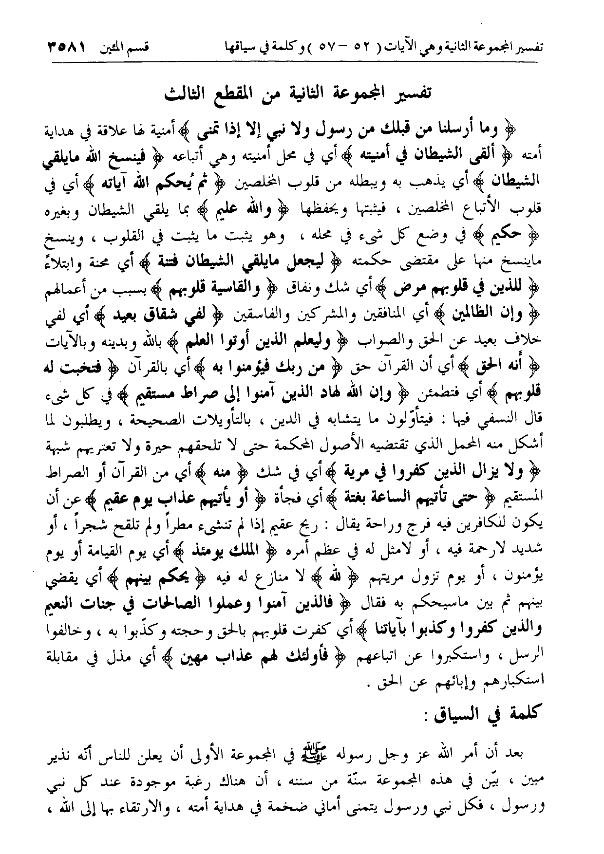 وَما أَرْسَلْنا مِنْ قَبْلِكَ مِنْ رَسُولٍ وَلا نَبِيٍّ إِلَّا إِذا تَمَنَّى أمنية لها علاقة في هداية أمته أَلْقَى الشَّيْطانُ فِي أُمْنِيَّتِهِ أي في محل أمنيته وهي أتباعه فَيَنْسَخُ اللَّهُ ما يُلْقِي الشَّيْطانُ أي يذهب به ويبطله من قلوب المخلصين ثُمَّ يُحْكِمُ اللَّهُ آياتِهِ أي في قلوب الأتباع المخلصين، فيثبتها ويحفظها وَاللَّهُ عَلِيمٌ بما يلقي الشيطان وبغيره حَكِيمٌ في وضع كل شئ في محله، وهو يثبت ما يثبت في القلوب، وينسخ ما ينسخ منها على مقتضى حكمته