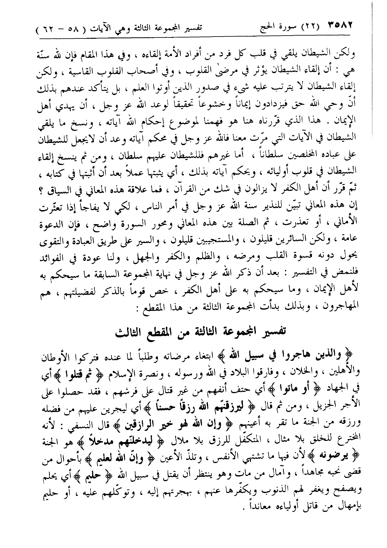 ولكن الشيطان يلقي في قلب كل فرد من أفراد الأمة إلقاءه، وفي هذا المقام فإن لله سنة هي: أن إلقاء الشيطان يؤثر في مرضى القلوب، وفي أصحاب القلوب القاسية، ولكن إلقاء الشيطان لا يترتب عليه شئ في صدور الذين أوتوا العلم، بل يتأكد عندهم بذلك أن وحي الله حق فيزدادون إيمانا وخشوعا تحقيقا لوعد الله عزّ وجل، أن يهدي أهل الإيمان. هذا الذي قررناه هنا هو فهمنا لموضوع إحكام الله آياته، ونسخ ما يلقي الشيطان في الآيات التي مرت معنا فالله عزّ وجل في محكم آياته وعد أن لا يجعل للشيطان على عباده المخلصين سلطانا، أما غيرهم فللشيطان عليهم سلطان، ومن ثم ينسخ إلقاء الشيطان في قلوب أوليائه، ويحكم آياته بذلك، أي يثبتها عملا بعد أن أثبتها في كتابه، ثم قرر أن أهل الكفر لا يزالون في شك من القرآن، فما علاقة هذه المعاني في السياق؟