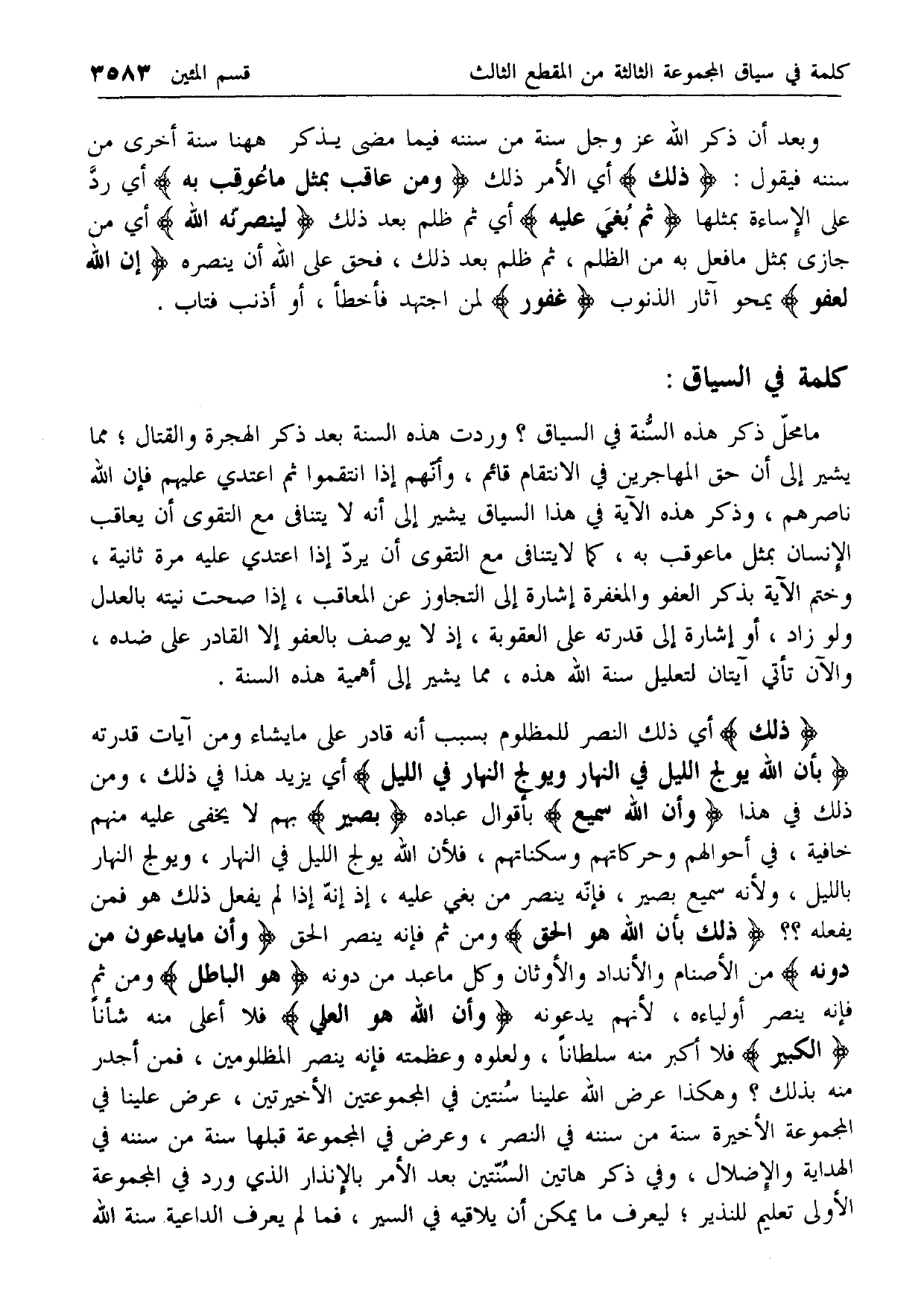 ما محل ذكر هذه السنة في السياق؟ وردت هذه السنة بعد ذكر الهجرة والقتال؛ مما يشير إلى أن حق المهاجرين في الانتقام قائم، وأنهم إذا انتقموا ثم اعتدي عليهم فإن الله ناصرهم، وذكر هذه الآية في هذا السياق يشير إلى أنه لا يتنافى مع التقوى أن يعاقب الإنسان بمثل ما عوقب به، كما لا يتنافى مع التقوى أن يرد إذا اعتدي عليه مرة ثانية، وختم الآية بذكر العفو والمغفرة إشارة إلى التجاوز عن المعاقب، إذا صحت نيته بالعدل ولو زاد، أو إشارة إلى قدرته على العقوبة، إذ لا يوصف بالعفو إلا القادر على ضده، والآن تأتي آيتان لتعليل سنة الله هذه، مما يشير إلى أهمية هذه السنة.