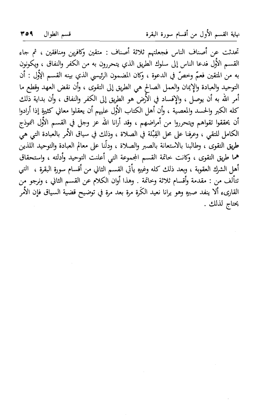 تحدثت عن أصناف الناس فجعلتهم ثلاثة أصناف: متقين وكافرين ومنافقين، ثم جاء القسم الأول فدعا الناس إلى سلوك الطريق الذي يتحررون به من الكفر وانفاق، ويكونون به من المتقين فعم وخص في الدعوة، وكان المضمون الرئيسي الذي بينه القسم الأول: أن التوحيد والعبادة والإيمان والعمل الصالح هي الطريق إلى التقوى، وأن نقض العهد وقطع ما أمر الله به أن يوصل، والإفساد في الأرض هو الطريق إلى الكفر والنفاق، وأن بداية ذلك كله الكبر والحسد والمعصية، وأن أهل الكتاب الأول عليهم أن يعقلوا معاني كثيرة إذا أرادوا أن يحققوا تقواهم ويتحرروا من أمراضهم، وقد أرانا الله عزّ وجل في القسم الأول النموذج الكامل للتقي، وعرفنا على محل القبلة في الصلاة، وذلك في سياق الأمر بالعبادة التي هي طريق التقوى، وطالبنا بالاستعانة بالصبر والصلاة، ودلنا على معالم العبادة والتوحيد اللذين هما طريق التقوى، وكانت خاتمة القسم المجموعة التي أعلنت التوحيد وأدلته، واستحقاق أهل الشرك العقوبة، وبعد ذلك كله وغيره يأتي القسم الثاني من أقسام سورة البقرة، التي تتألف من: مقدمة وأقسام ثلاثة وخاتمة. وهذا أوان الكلام عن القسم الثاني، ونرجو من القارئ ألا ينفد صبره وهو يرانا نعيد الكرة مرة بعد مرة في توضيح قضية السياق فإن الأمر يحتاج لذلك.