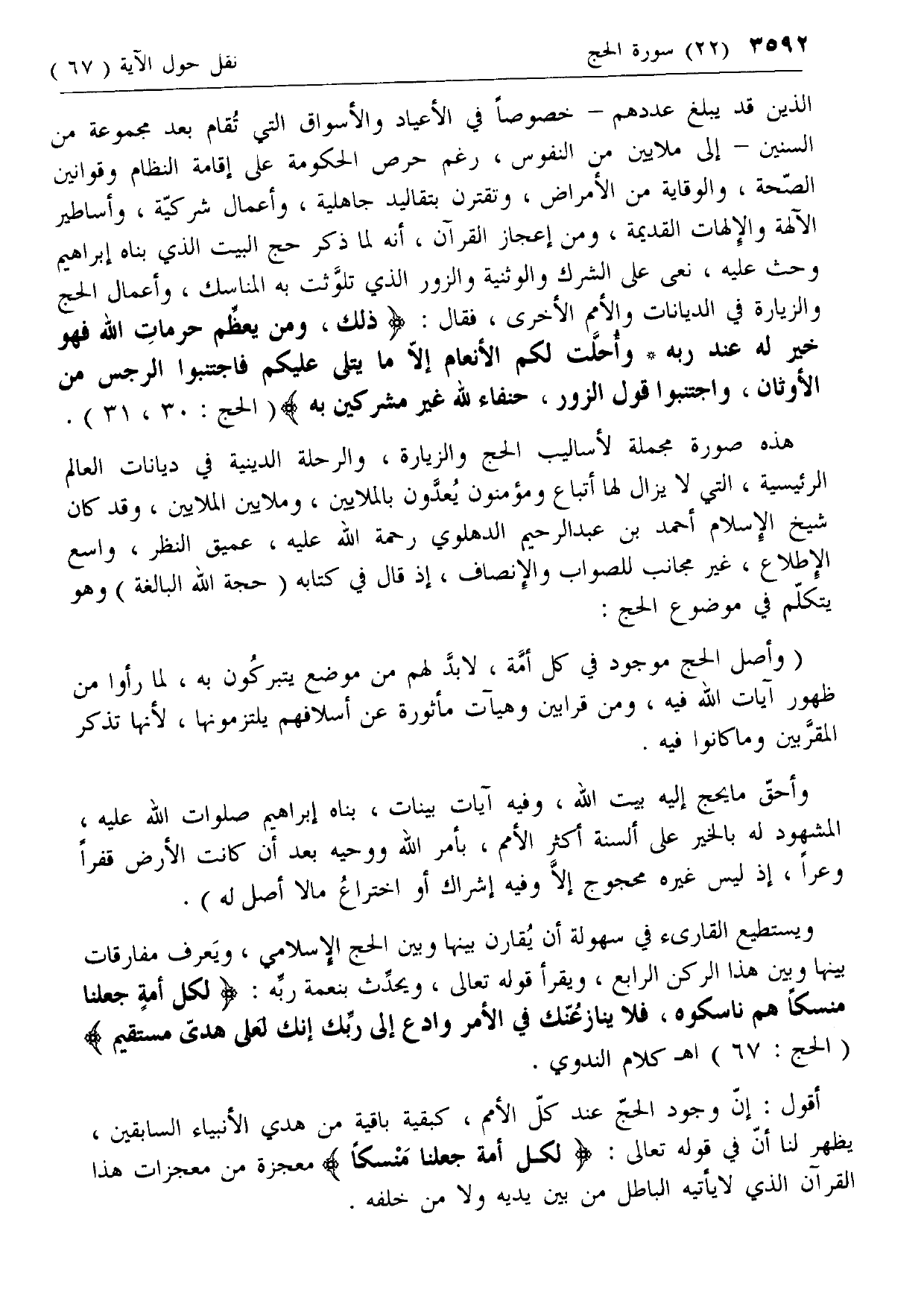 أقول: إن وجود الحج عند كل الأمم، كبقية باقية من هدي الأنبياء السابقين، يظهر لنا أن في قوله تعالى: لِكُلِّ أُمَّةٍ جَعَلْنا مَنْسَكاً معجزة من معجزات هذا القرآن الذي لا يأتيه الباطل من بين يديه ولا من خلفه.