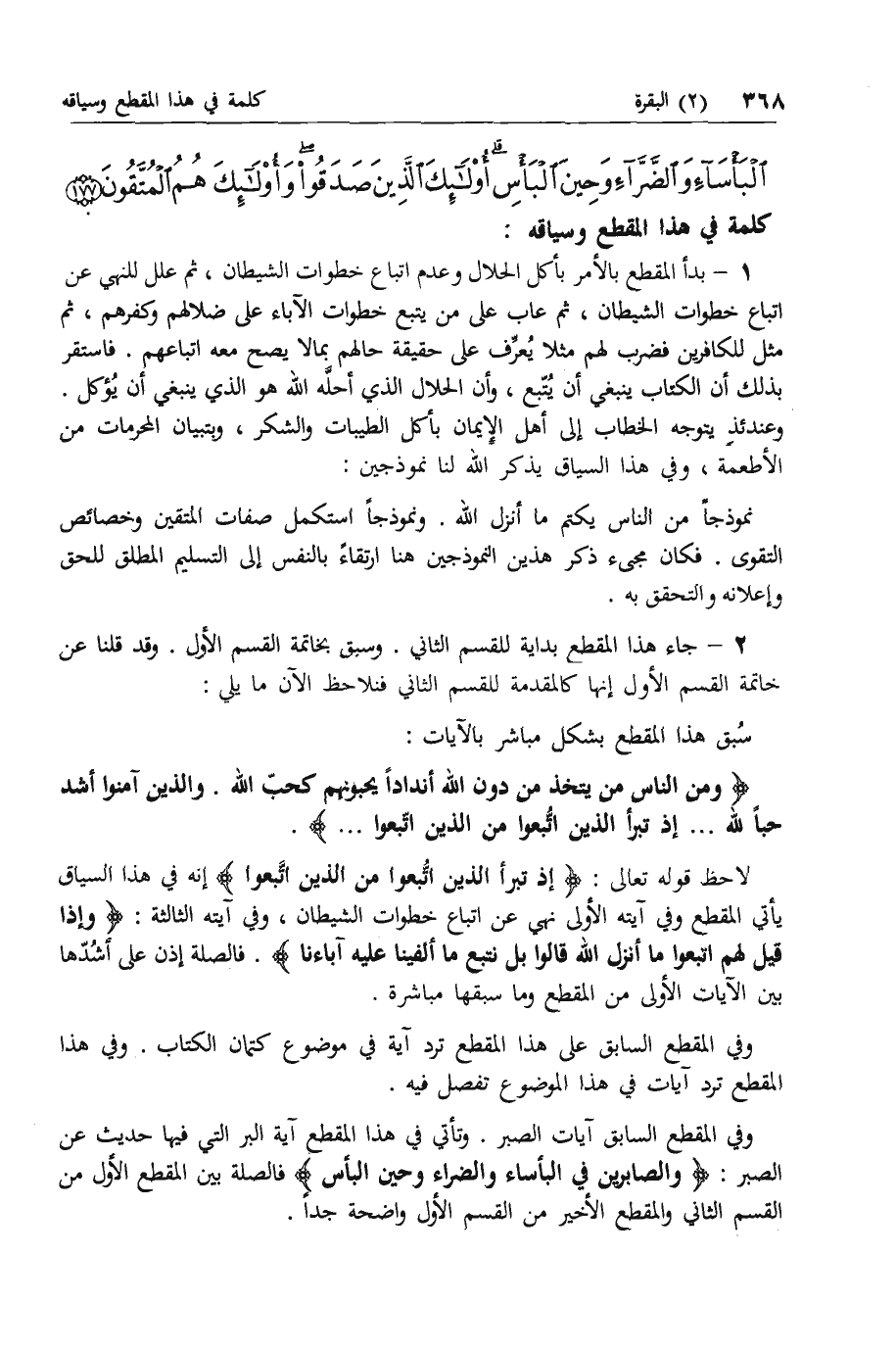 لاحظ قوله تعالى: إِذْ تَبَرَّأَ الَّذِينَ اتُّبِعُوا مِنَ الَّذِينَ اتَّبَعُوا إنه في هذا السياق يأتي المقطع وفي آيته الأولى نهي عن اتباع خطوات الشيطان، وفي آيته الثالثة: وَإِذا قِيلَ لَهُمُ اتَّبِعُوا ما أَنْزَلَ اللَّهُ قالُوا بَلْ نَتَّبِعُ ما أَلْفَيْنا عَلَيْهِ آباءَنا. فالصلة إذن على أشدها بين الآيات الأولى من المقطع وما سبقها مباشرة.