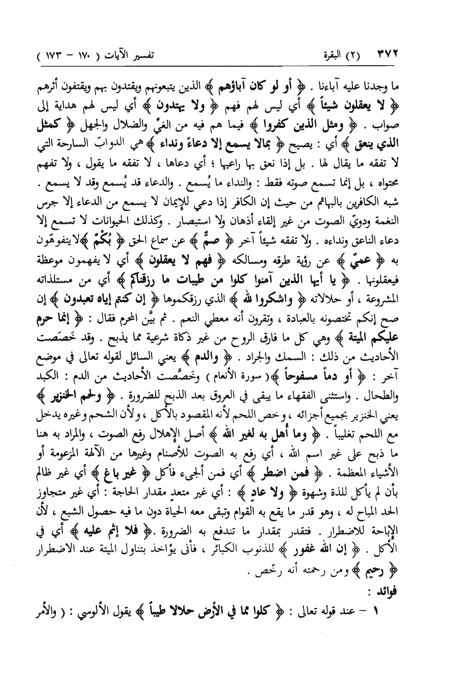 ثم بين المحرم فقال: إِنَّما حَرَّمَ عَلَيْكُمُ الْمَيْتَةَ وهي كل ما فارق الروح من غير ذكاة شرعية مما يذبح. وقد خصصت الأحاديث من ذلك: السمك والجراد. وَالدَّمَ يعني السائل لقوله تعالى في موضع آخر: أَوْ دَماً مَسْفُوحاً (سورة الأنعام) وخصصت الأحاديث من الدم: الكبد والطحال. واستثنى الفقهاء ما يبقى في العروق بعد الذبح للضرورة. وَلَحْمَ الْخِنْزِيرِ يعني الخنزير بجميع أجزائه، وخص اللحم لأنه المقصود بالأكل، ولأن الشحم وغيره يدخل مع اللحم تغليبا. وَما أُهِلَّ بِهِ لِغَيْرِ اللَّهِ أصل الإهلال رفع الصوت، والمراد به هنا ما ذبح على غير اسم الله، أي رفع به الصوت للأصنام وغيرها من الآلهة المزعومة أو الأشياء المعظمة. فَمَنِ اضْطُرَّ أي فمن ألجئ فأكل غَيْرَ باغٍ أي غير ظالم بأن لم يأكل للذة وشهوة وَلا عادٍ: أي غير متعد مقدار الحاجة: أي غير متجاوز الحد المباح له، وهو قدر ما يقع به القوام وتبقى معه الحياة دون ما فيه حصول الشبع، لأن الإباحة للاضطرار. فتقدر بمقدار ما تندفع به الضرورة. فَلا إِثْمَ عَلَيْهِ أي في الأكل. إِنَّ اللَّهَ غَفُورٌ للذنوب الكبائر، فأنى يؤاخذ بتناول الميتة عند الاضطرار رَحِيمٌ ومن رحمته أنه رخص.