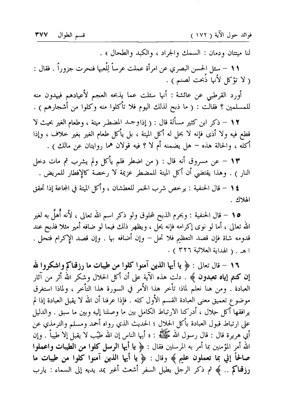 16 - قال تعالى: يا أَيُّهَا الَّذِينَ آمَنُوا كُلُوا مِنْ طَيِّباتِ ما رَزَقْناكُمْ وَاشْكُرُوا لِلَّهِ إِنْ كُنْتُمْ إِيَّاهُ تَعْبُدُونَ. دلت هذه الآية على أن أكل الحلال وشكر الله أثر من آثار العبادة. ومن هنا نعلم لماذا تأخر هذا الأمر في السورة هذا التأخر، ولماذا استغرق موضوع تعميق معنى العبادة القسم الأول كله. فإذا عرفنا أن الله لا يقبل العبادة إذا لم يرافقها أكل جلال، أدركنا الارتباط الكامل بين ما وصلنا إليه وبين ما سبق. والدليل على ارتباط قبول العبادة بأكل الحلال؛ الحديث الذي رواه أحمد ومسلم والترمذي عن أبي هريرة قال: قال رسول الله صلى الله عليه وسلم: «أيها الناس إن الله طيب لا يقبل إلا طيبا. وإن الله أمر المؤمنين بما أمر به المرسلين فقال: يا أَيُّهَا الرُّسُلُ كُلُوا مِنَ الطَّيِّباتِ وَاعْمَلُوا صالِحاً إِنِّي بِما تَعْمَلُونَ عَلِيمٌ وقال: يا أَيُّهَا الَّذِينَ آمَنُوا كُلُوا مِنْ طَيِّباتِ ما رَزَقْناكُمْ .. ثم ذكر الرجل يطيل السفر أشعث أغبر يمد يديه إلى السماء: يا رب