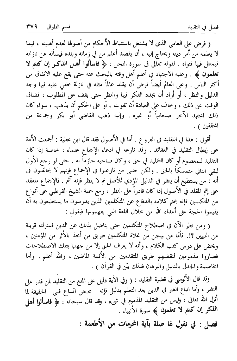 (فرض على العامي الذي لا يشتغل باستنباط الأحكام من أصولها لعدم أهليته، فيما لا يعلمه من أمر دينه ويحتاج إليه، أن يقصد أعلم من في زمانه وبلده فيسأله عن نازلته فيمتثل فيها فتواه. لقوله تعالى فى سورة النحل: فَسْئَلُوا أَهْلَ الذِّكْرِ إِنْ كُنْتُمْ لا تَعْلَمُونَ. وعليه الاجتهاد في أعلم أهل وقته بالبحث عنه حتى يقع عليه الاتفاق من أكثر الناس. وعلى العالم أيضا فرض أن يقلد عالما مثله في نازلة خفي عليه فيها وجه الدليل والنظر، أو أراد أن يجدد الفكر فيها والنظر حتى يقف على المطلوب، فضاق الوقت عن ذلك، وخاف على العبادة أن تفوت، أو على الحكم أن يذهب، سواء كان ذلك المجتهد الآخر صحابيا أو غيره. وإليه ذهب القاضي أبو بكر وجماعة من المحققين).