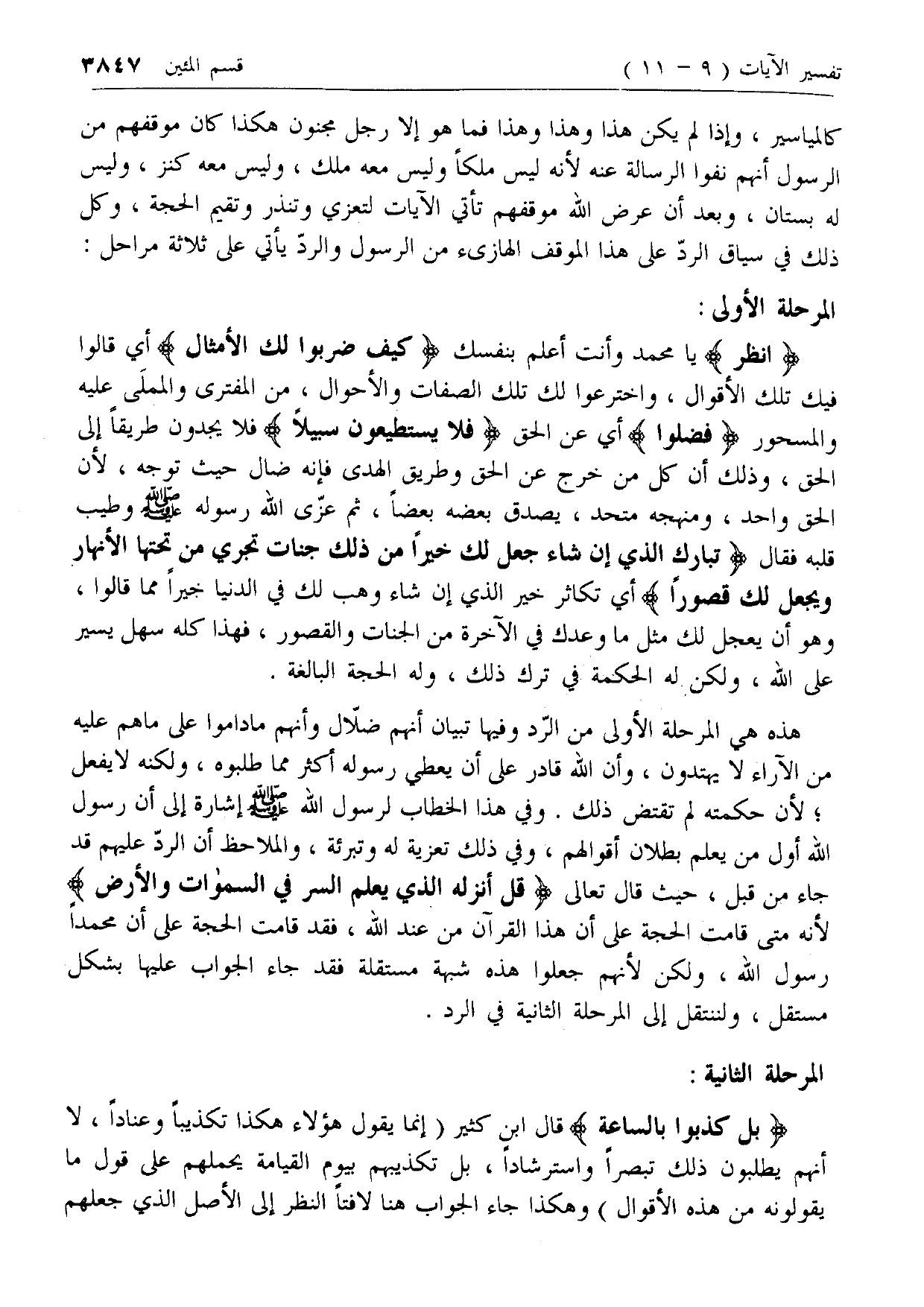 هذه هي المرحلة الأولى من الرد وفيها تبيان أنهم ضلال وأنهم ما داموا على ما هم عليه من الآراء لا يهتدون، وأن الله قادر على أن يعطي رسوله أكثر مما طلبوه، ولكنه لا يفعل؛ لأن حكمته لم تقتض ذلك. وفي هذا الخطاب لرسول الله صلى الله عليه وسلم إشارة إلى أن رسول الله أول من يعلم بطلان أقوالهم، وفي ذلك تعزية له وتبرئة، والملاحظ أن الرد عليهم قد جاء من قبل، حيث قال تعالى قُلْ أَنْزَلَهُ الَّذِي يَعْلَمُ السِّرَّ فِي السَّماواتِ وَالْأَرْضِ لأنه متى قامت الحجة على أن هذا القرآن من عند الله، فقد قامت الحجة على أن محمدا رسول الله، ولكن لأنهم جعلوا هذه شبهة مستقلة فقد جاء الجواب عليها بشكل مستقل، ولننتقل إلى المرحلة الثانية في الرد.