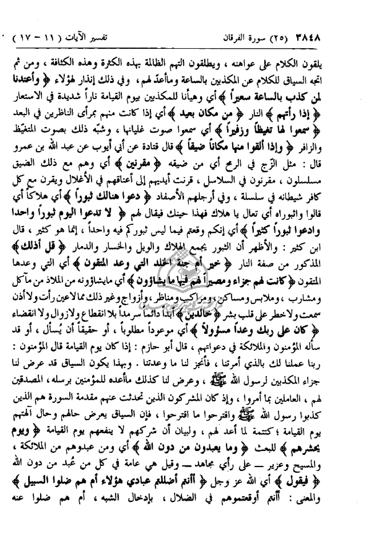 وَإِذا أُلْقُوا مِنْها مَكاناً ضَيِّقاً قال قتادة عن أبي أيوب عن عبد الله بن عمرو قال: مثل الزج في الرمح أي من ضيقه مُقَرَّنِينَ أي وهم مع ذلك الضيق مسلسلون، مقرنون في السلاسل، قرنت أيديهم إلى أعناقهم في الأغلال ويقرن مع كل كافر شيطانه في سلسلة، وفي أرجلهم الأصفاد دَعَوْا هُنالِكَ ثُبُوراً أي هلاكا أي قالوا وا ثبوراه أي تعال يا هلاك فهذا حينك