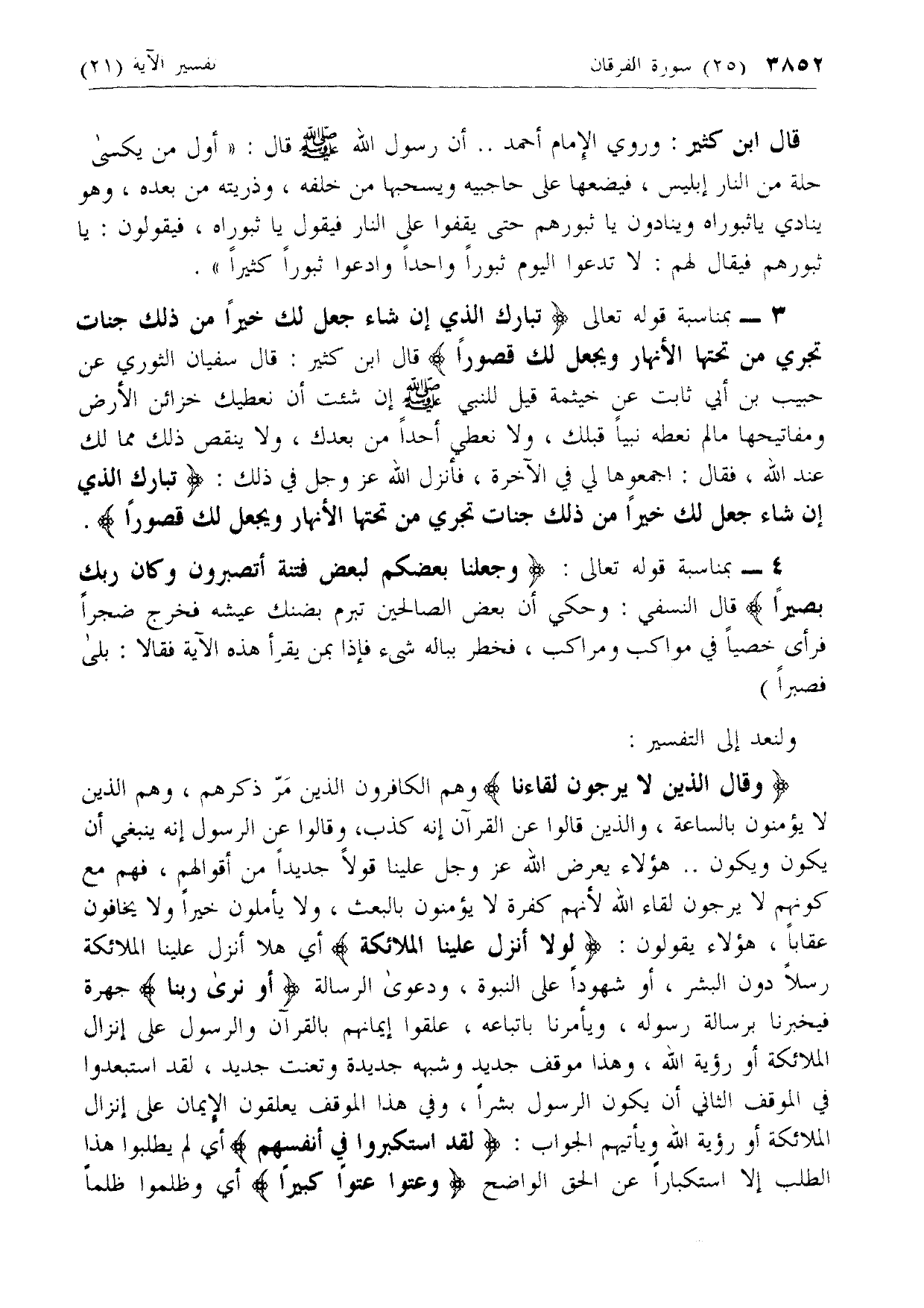 3 - بمناسبة قوله تعالى تَبارَكَ الَّذِي إِنْ شاءَ جَعَلَ لَكَ خَيْراً مِنْ ذلِكَ جَنَّاتٍ تَجْرِي مِنْ تَحْتِهَا الْأَنْهارُ وَيَجْعَلْ لَكَ قُصُوراً قال ابن كثير: قال سفيان الثوري عن حبيب بن أبي ثابت عن خيثمة قيل للنبي صلى الله عليه وسلم إن شئت أن نعطيك خزائن الأرض ومفاتيحها ما لم نعطه نبيا قبلك، ولا نعطي أحدا من بعدك، ولا ينقص ذلك مما لك عند الله، فقال: اجمعوها لي في الآخرة، فأنزل الله عزّ وجل في ذلك: تَبارَكَ الَّذِي إِنْ شاءَ جَعَلَ لَكَ خَيْراً مِنْ ذلِكَ جَنَّاتٍ تَجْرِي مِنْ تَحْتِهَا الْأَنْهارُ وَيَجْعَلْ لَكَ قُصُوراً.