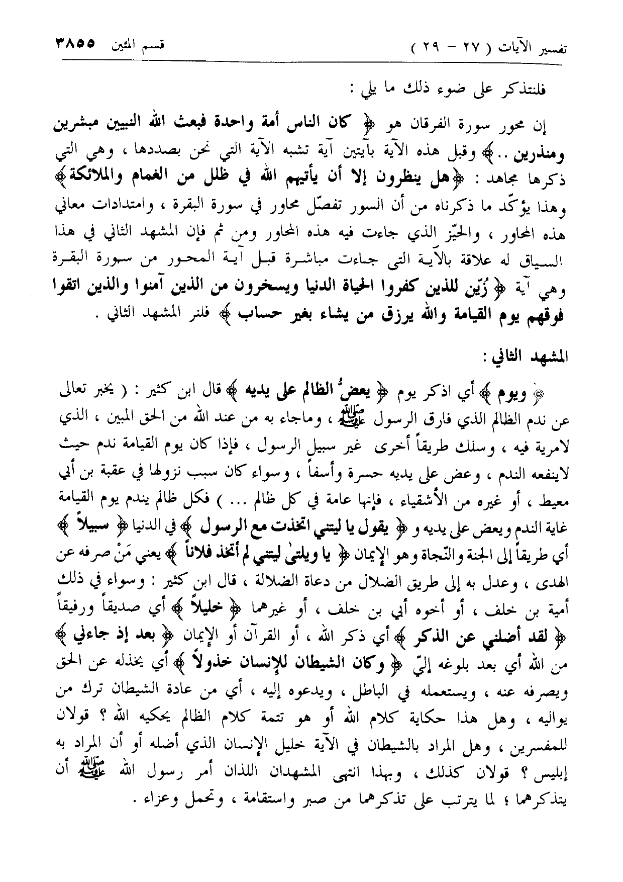 إن محور سورة الفرقان هو كانَ النَّاسُ أُمَّةً واحِدَةً فَبَعَثَ اللَّهُ النَّبِيِّينَ مُبَشِّرِينَ وَمُنْذِرِينَ .. وقبل هذه الآية بآيتين آية تشبه الآية التي نحن بصددها، وهي التي ذكرها مجاهد: هَلْ يَنْظُرُونَ إِلَّا أَنْ يَأْتِيَهُمُ اللَّهُ فِي ظُلَلٍ مِنَ الْغَمامِ وَالْمَلائِكَةُ وهذا يؤكد ما ذكرناه من أن السور تفصل محاور في سورة البقرة، وامتدادات معاني هذه المحاور، والحيز الذي جاءت فيه هذه المحاور ومن ثم فإن المشهد الثاني في هذا السياق له علاقة بالآية التى جاءت مباشرة قبل آية المحور من سورة البقرة وهي آية زُيِّنَ لِلَّذِينَ كَفَرُوا الْحَياةُ الدُّنْيا وَيَسْخَرُونَ مِنَ الَّذِينَ آمَنُوا وَالَّذِينَ اتَّقَوْا فَوْقَهُمْ يَوْمَ الْقِيامَةِ وَاللَّهُ يَرْزُقُ مَنْ يَشاءُ بِغَيْرِ حِسابٍ فلنر المشهد الثاني.