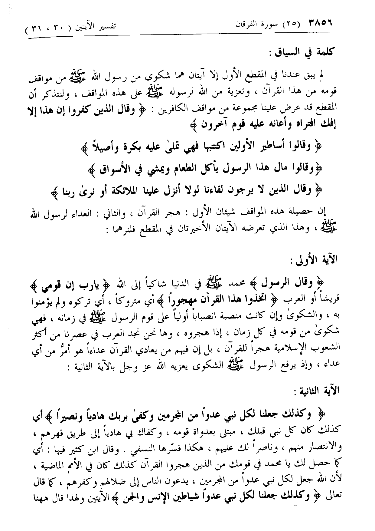 وَقالَ الرَّسُولُ محمد صلى الله عليه وسلم في الدنيا شاكيا إلى الله يا رَبِّ إِنَّ قَوْمِي قريشا أو العرب اتَّخَذُوا هذَا الْقُرْآنَ مَهْجُوراً أي متروكا، أي تركوه ولم يؤمنوا به، والشكوى وإن كانت منصبة انصبابا أوليا على قوم الرسول صلى الله عليه وسلم في زمانه، فهي شكوى من قومه في كل زمان، إذا هجروه، وها نحن نجد العرب في عصرنا من أكثر الشعوب الإسلامية هجرا للقرآن، بل إن فيهم من يعادي القرآن عداء هو أمر من أي عداء، وإذ يرفع الرسول صلى الله عليه وسلم الشكوى يعزيه الله عزّ وجل بالآية الثانية: