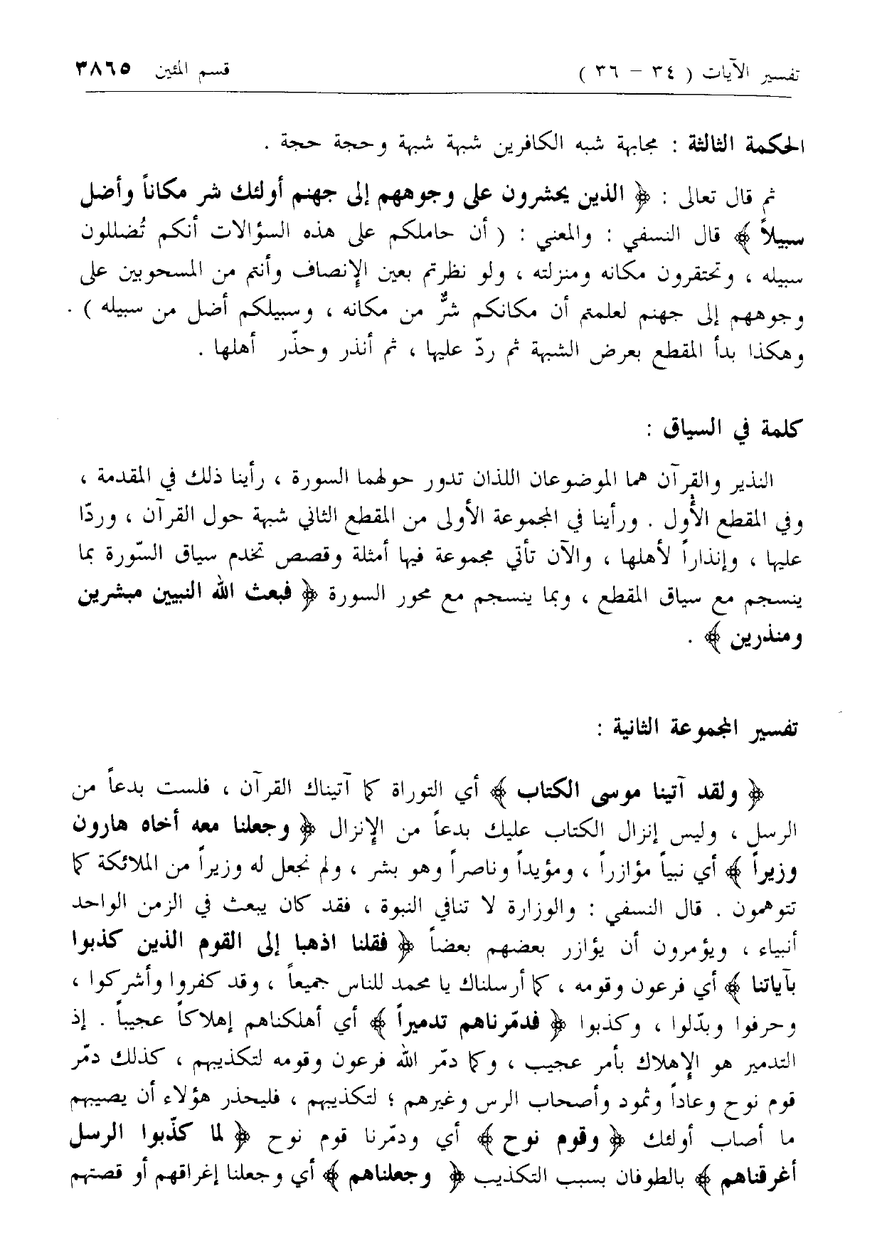 ثم قال تعالى: الَّذِينَ يُحْشَرُونَ عَلى وُجُوهِهِمْ إِلى جَهَنَّمَ أُوْلئِكَ شَرٌّ مَكاناً وَأَضَلُّ سَبِيلًا قال النسفي: والمعنى: (أن حاملكم على هذه السؤالات أنكم تضللون سبيله، وتحتقرون مكانه ومنزلته، ولو نظرتم بعين الإنصاف وأنتم من المسحوبين على وجوههم إلى جهنم لعلمتم أن مكانكم شر من مكانه، وسبيلكم أضل من سبيله).