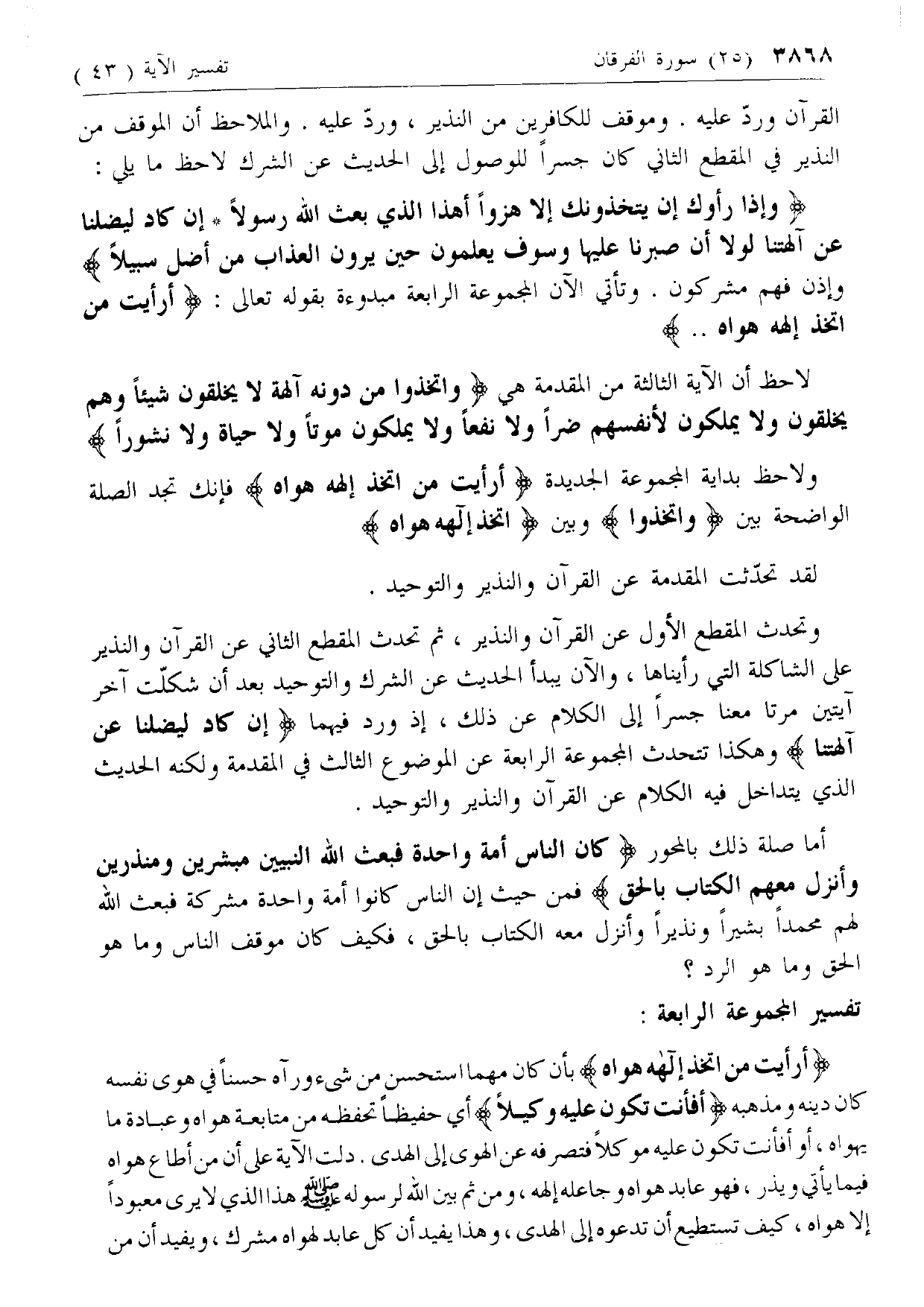 وَإِذا رَأَوْكَ إِنْ يَتَّخِذُونَكَ إِلَّا هُزُواً أَهذَا الَّذِي بَعَثَ اللَّهُ رَسُولًا* إِنْ كادَ لَيُضِلُّنا عَنْ آلِهَتِنا لَوْلا أَنْ صَبَرْنا عَلَيْها وَسَوْفَ يَعْلَمُونَ حِينَ يَرَوْنَ الْعَذابَ مَنْ أَضَلُّ سَبِيلًا وإذن فهم مشركون. وتأتي الآن المجموعة الرابعة مبدوءة بقوله تعالى: أَرَأَيْتَ مَنِ اتَّخَذَ إِلهَهُ هَواهُ ..