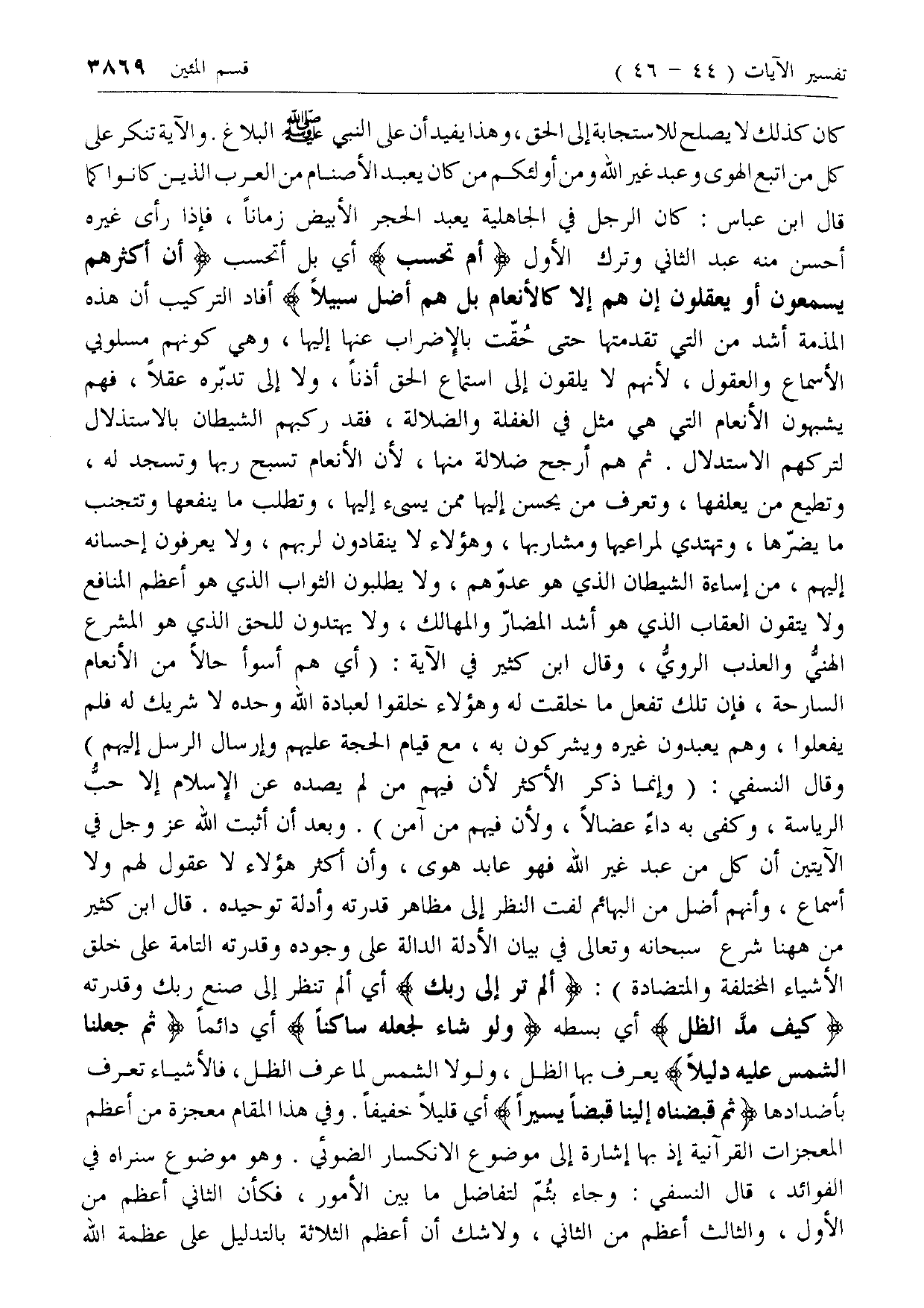 أَمْ تَحْسَبُ أي بل أتحسب أَنَّ أَكْثَرَهُمْ يَسْمَعُونَ أَوْ يَعْقِلُونَ إِنْ هُمْ إِلَّا كَالْأَنْعامِ بَلْ هُمْ أَضَلُّ سَبِيلًا أفاد التركيب أن هذه المذمة أشد من التي تقدمتها حتى حقت بالإضراب عنها إليها، وهي كونهم مسلوبي الأسماع والعقول، لأنهم لا يلقون إلى استماع الحق أذنا، ولا إلى تدبره عقلا، فهم يشبهون الأنعام التي هي مثل في الغفلة والضلالة، فقد ركبهم الشيطان بالاستذلال لتركهم الاستدلال. ثم هم أرجح ضلالة منها، لأن الأنعام تسبح ربها وتسجد له، وتطيع من يعلفها، وتعرف من يحسن إليها ممن يسئ إليها، وتطلب ما ينفعها وتتجنب ما يضرها، وتهتدي لمراعيها ومشاربها، وهؤلاء لا ينقادون لربهم، ولا يعرفون إحسانه إليهم، من إساءة الشيطان الذي هو عدوهم، ولا يطلبون الثواب الذي هو أعظم المنافع ولا يتقون العقاب الذي هو أشد المضار والمهالك، ولا يهتدون للحق الذي هو المشرع الهني والعذب الروي، وقال ابن كثير في الآية: (أي هم أسوأ حالا من الأنعام السارحة، فإن تلك تفعل ما خلقت له وهؤلاء خلقوا لعبادة الله وحده لا شريك له فلم يفعلوا، وهم يعبدون غيره ويشركون به، مع قيام الحجة عليهم وإرسال الرسل إليهم) وقال النسفي: (وإنما ذكر الأكثر لأن فيهم من لم يصده عن الإسلام إلا حب الرئاسة، وكفى به داء عضالا، ولأن فيهم من آمن). وبعد أن أثبت الله عزّ وجل في الآيتين أن كل من عبد غير الله فهو عابد هوى، وأن أكثر هؤلاء لا عقول لهم ولا أسماع، وأنهم أضل من البهائم لفت النظر إلى مظاهر قدرته وأدلة توحيده. قال ابن كثير من هاهنا شرع سبحانه وتعالى في بيان الأدلة الدالة على وجوده وقدرته التامة على خلق الأشياء المختلفة والمتضادة: